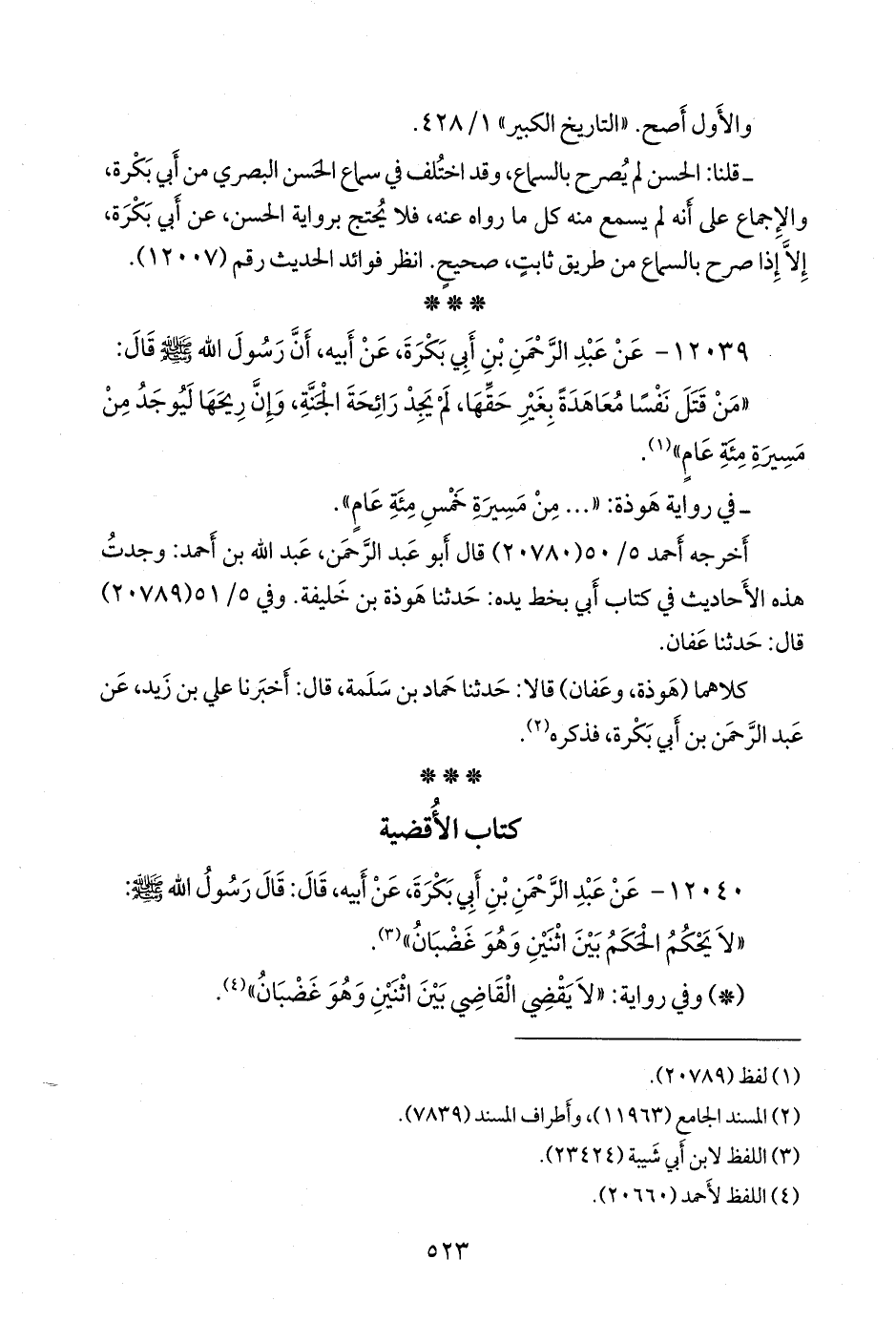 - وفي رواية: «عن عبد الرَّحمَن بن أَبي بَكْرة، قال: كتب أَبو بَكرَة إلى ابنه، وهو عامل بسجستان، أن لا تقضي بين رجلين وأنت غضبان، فإني سمعت رسول الله صَلى الله عَليه وسَلم يقول: لا يقض حكم بين اثنين، أو خصمين، وهو غضبان» (¬٣).
