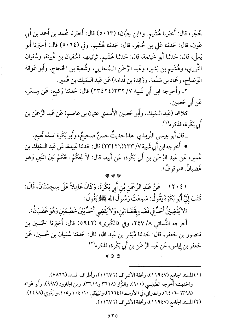 ١٢٠٤١ - عن عبد الرَّحمَن بن أَبي بَكْرة، وكان عاملا على سجستان، قال: كتب إلي أَبو بَكرَة يقول: سمعت رسول الله صَلى الله عَليه وسَلم يقول: