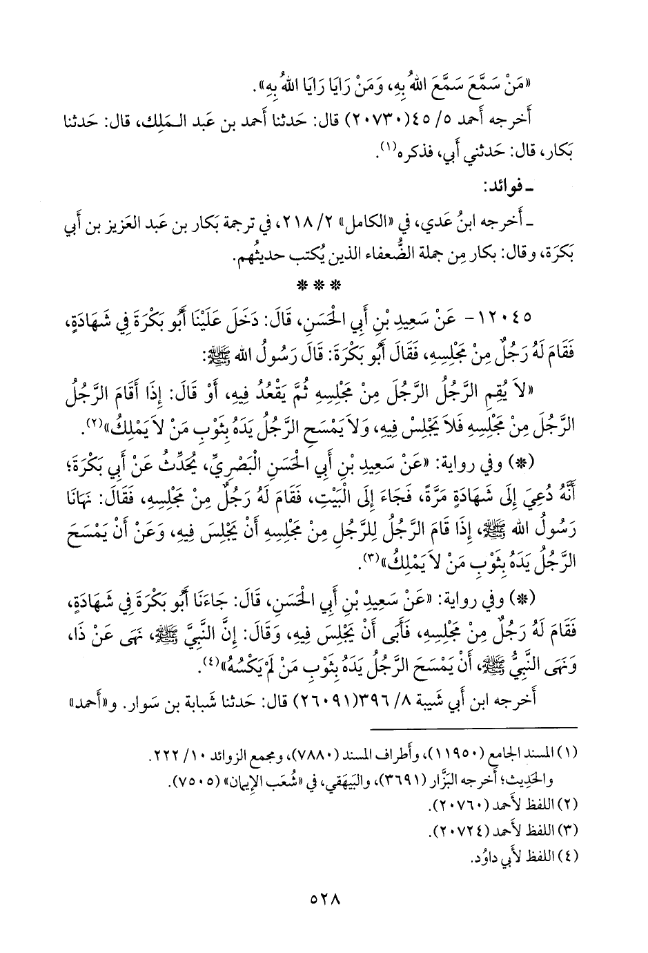 ١٢٠٤٥ - عن سعيد بن أبي الحسن، قال: دخل علينا أَبو بَكرَة في شهادة، فقام له رجل من مجلسه، فقال أَبو بَكرَة: قال رسول الله صَلى الله عَليه وسَلم: