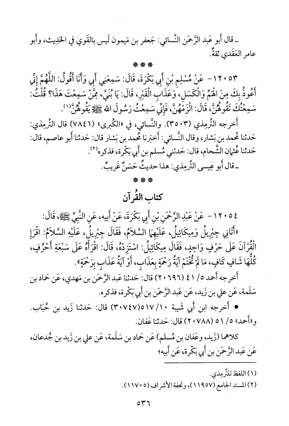 أخرجه التِّرمِذي (٣٥٠٣). والنَّسَائي في «الكبرى» (٧٨٤١) قال التِّرمِذي: حدثنا محمد بن بشار، وقال النَّسَائي: أخبرنا محمد بن بشار قال: حدثنا أَبو عاصم، قال: حدثنا عثمان الشحام، قال: حدثني مسلم بن أَبي بَكْرة، فذكره (¬٢).