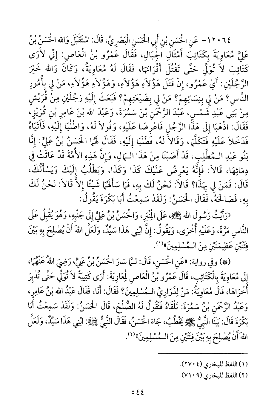- وفي رواية: «عن الحسن، قال: لما سار الحسن بن علي، رضي الله عنهما، إلى معاوية بالكتائب، قال عَمرو بن العاص لمعاوية: أرى كتيبة لا تولي حتى تدبر أخراها، قال معاوية: من لذراري المسلمين؟ فقال: أنا، فقال عبد الله بن عامر، وعبد الرَّحمَن بن سَمُرَة: نلقاه فنقول له الصلح، قال الحسن: ولقد سمعت أبا بكرة قال: بينا النبي صَلى الله عَليه وسَلم يخطب، جاء الحسن، فقال النبي صَلى الله عَليه وسَلم: ابني هذا سيد، ولعل الله أن يصلح به بين فئتين من المسلمين» (¬٢).