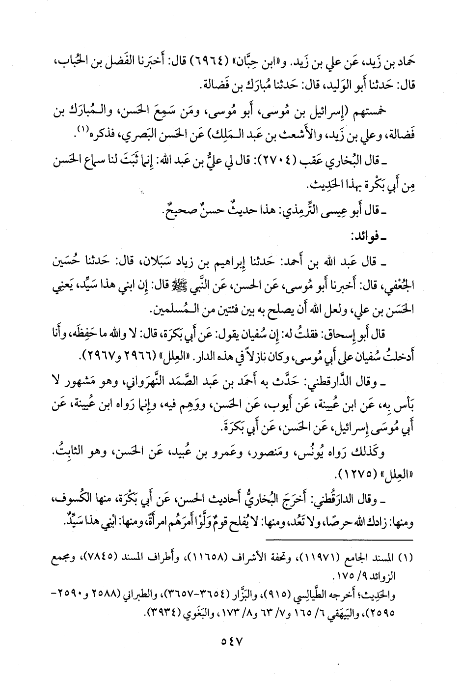 - وقال الدارقُطني: أخرج البخاري أحاديث الحسن، عن أَبي بَكْرة، منها الكسوف، ومنها: زادك الله حِرصًا، ولا تَعُدْ، ومنها: لا يفلح قوم ولوا أمرهم امرأة، ومنها: ابني هذا سيد