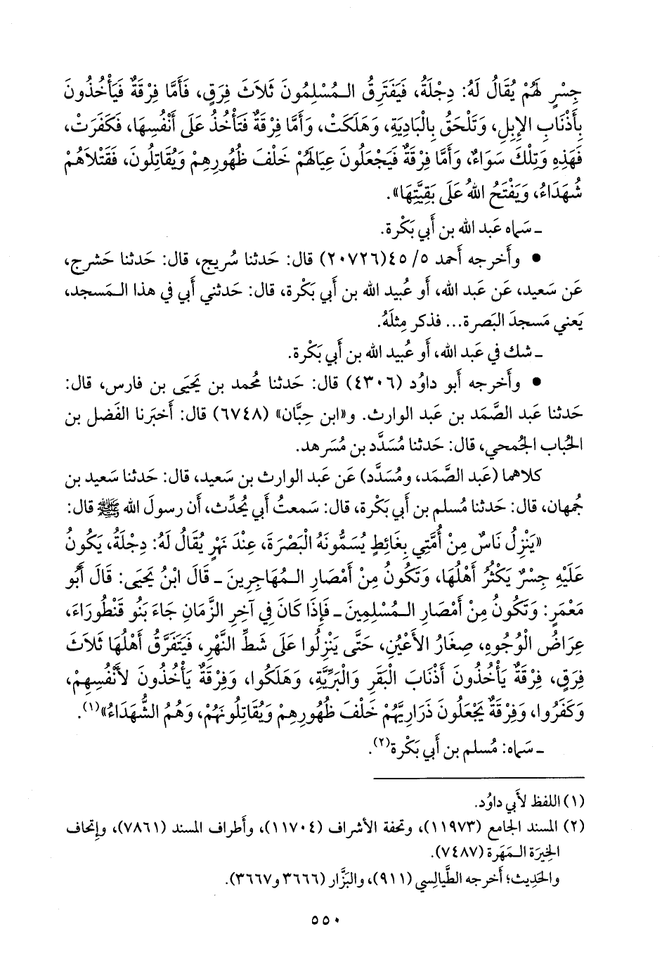 كلاهما (عبد الصمد، ومُسَدَّد) عن عبد الوارث بن سعيد، قال: حدثنا سعيد بن جُمهان، قال: حدثنا مسلم بن أَبي بَكْرة، قال: سمعت أبي يحدث، أن رسول الله صَلى الله عَليه وسَلم قال: