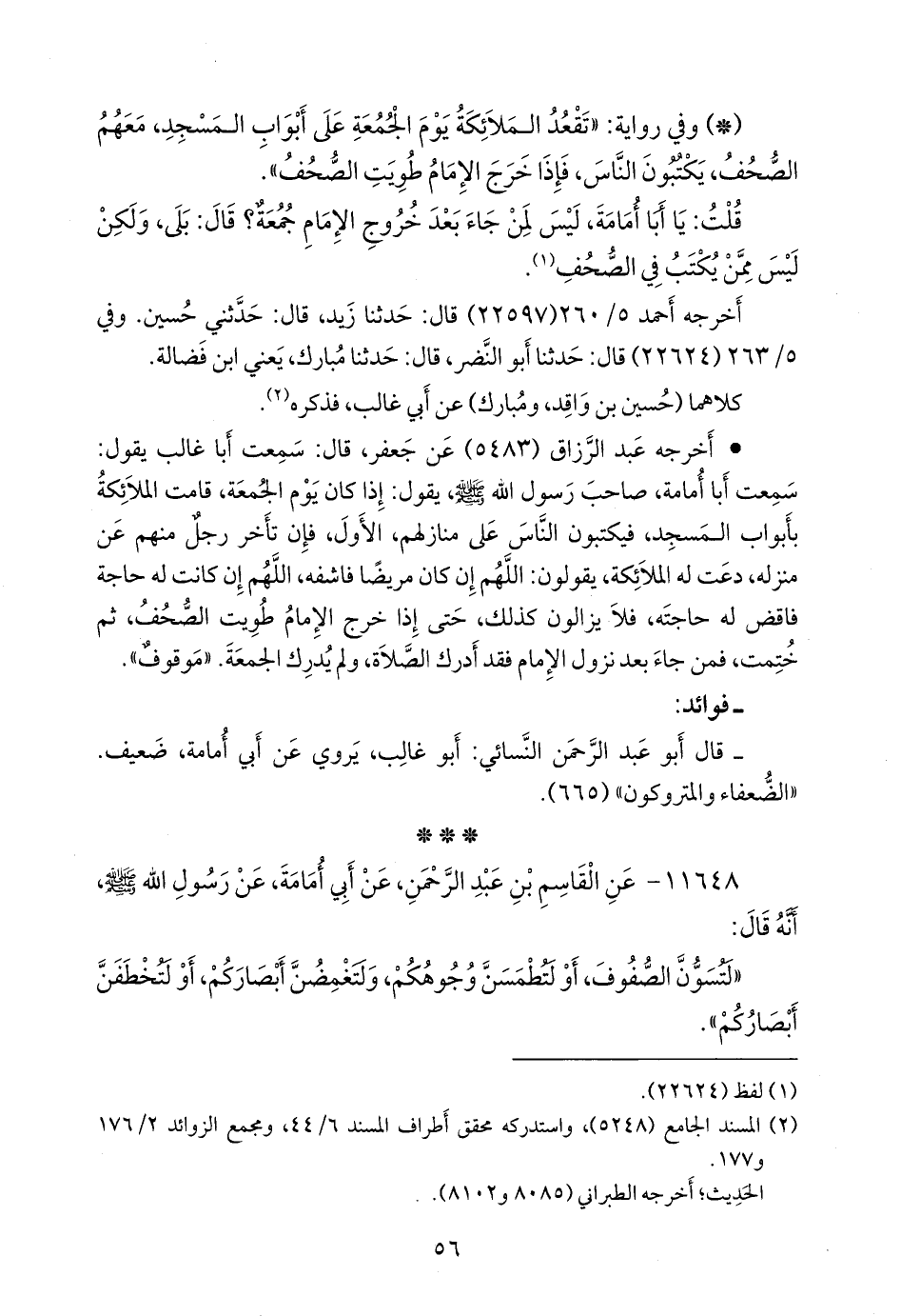 • أخرجه عبد الرزاق (٥٤٨٣) عن جعفر، قال: سمعت أبا غالب يقول: سمعت أَبا أُمامة، صاحب رسول الله صَلى الله عَليه وسَلم يقول: إذا كان يوم الجمعة، قامت الملائكة بأَبواب المسجد، فيكتبون الناس على منازلهم، الأول، فإن تأخر رجل منهم عن منزله، دعت له الملائكة، يقولون: اللهم إن كان مريضا فاشفه، اللهم إن كانت له حاجة فاقض له حاجته، فلا يزالون كذلك، حتى إذا خرج الإمام طويت الصحف، ثم ختمت، فمن جاء بعد نزول الإمام فقد أدرك الصلاة، ولم يدرك الجمعة. «موقوف».