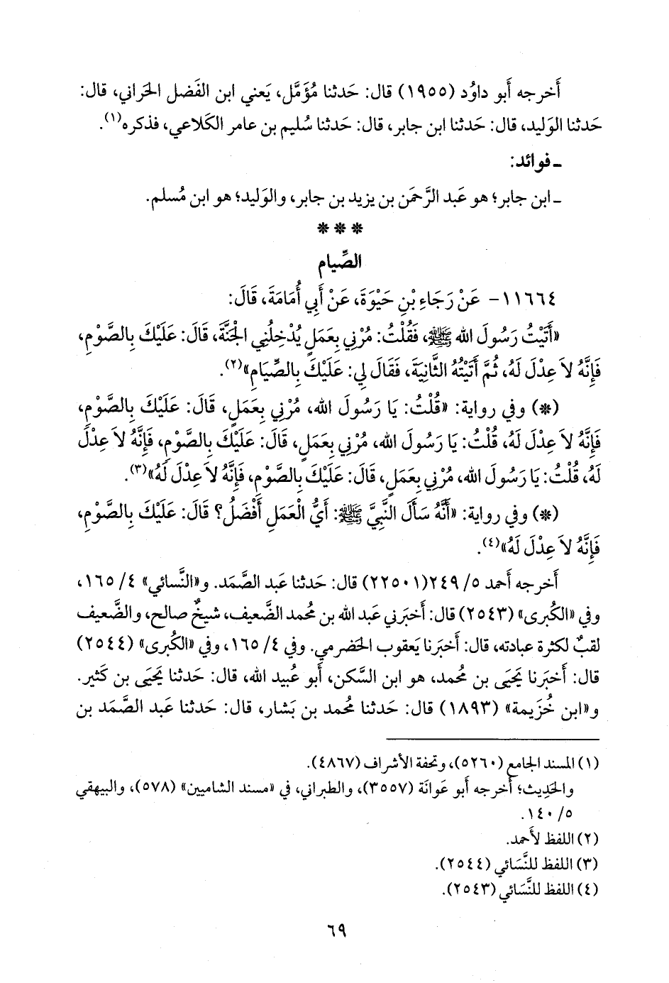 - وفي رواية: «قلت: يا رسول الله، مرني بعمل، قال: عليك بالصوم، فإنه لا عدل له، قلت: يا رسول الله، مرني بعمل، قال: عليك بالصوم، فإنه لا عدل له، قلت: يا رسول الله، مرني بعمل، قال: عليك بالصوم، فإنه لا عدل له» (¬٢).