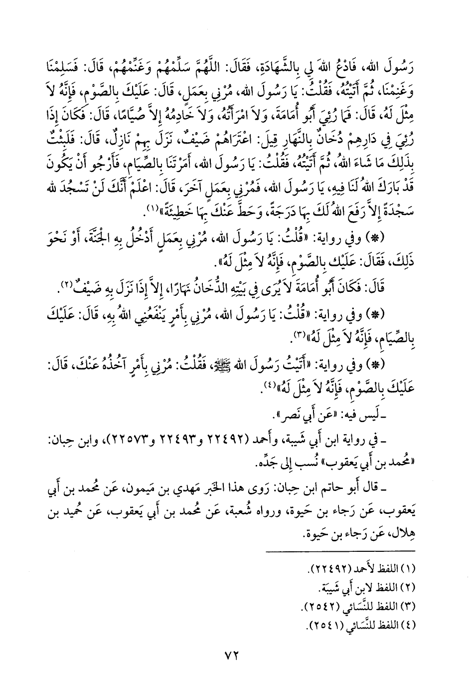 - وفي رواية: «أتيت رسول الله صَلى الله عَليه وسَلم فقلت: مرني بأمر آخذه عنك، قال: عليك بالصوم، فإنه لا مثل له» (¬٤).
