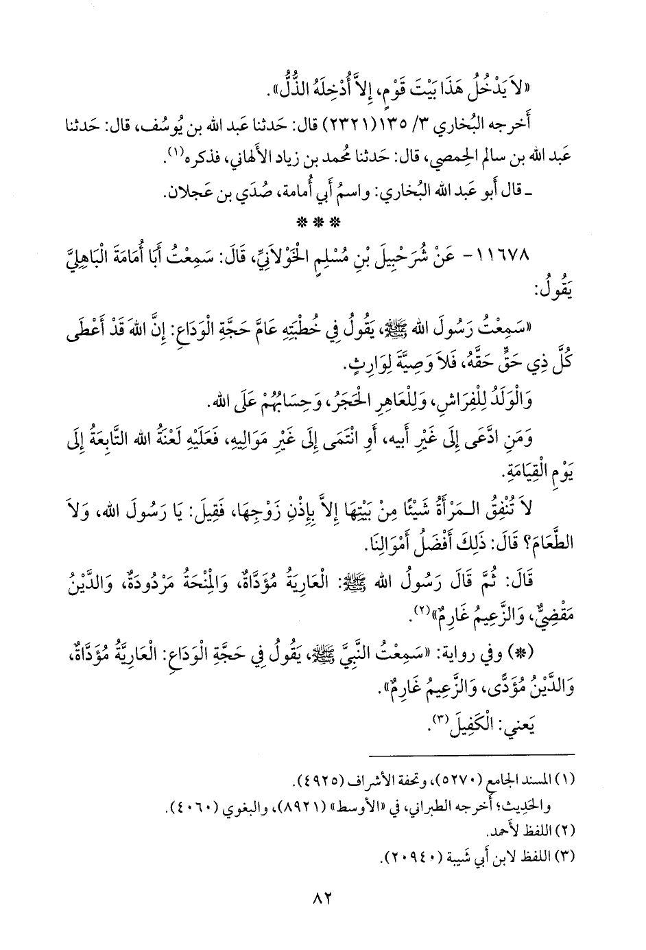 - وفي رواية: «سمعت النبي صَلى الله عَليه وسَلم يقول في حجة الوداع: العارِيَّة مؤداة، والدين مؤدى، والزعيم غارم».