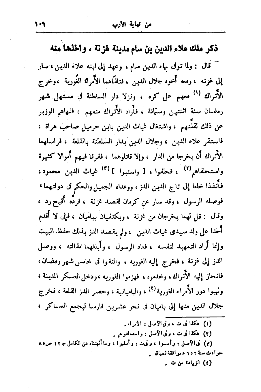 قال: ولما توفى بهاء الدين سام، وعهد إلى ابنه علاء الدين، سار إلى غزنه، ومعه أخوه جلال الدين، فتلقّاهما الأمراء الغورية، وخرج الأتراك «1» معهم على كره، ونزلا دار السلطنة في مستهل شهر رمضان سنة اثنتين وستمائة، فأراد الأتراك منعهم، فنهاهم الوزير عن ذلك لقلّتهم، واشتغال غياث الدين بابن حرميل صاحب هراة، فاستقر علاء الدين، وجلال الدين بدار السلطنة بالقلعة، فراسلهما الأتراك أن يخرجا من الدار، وإلا قاتلوهما، ففرقا فيهم أموالا كثيرة واستحلفاهم «2» ، فحلفوا، [واستبوا] «3» غياث الدين محمود، فأنفذا خلعا إلى تاج الدين الدز، ووعداه الجميل والحكم في دولتهما، فوصله الرسول، وقد سار عن كرمان لقصد غزنة، فردّه أقبح رد، وقال: قل لهما يخرجان من غزنة، ويكتفيان بباميان، فإنى لا أقدم أحدا على ولد سيدى غياث الدين، ولم يقصد الدز بذلك حفظ البيت وإنما أراد التمهيد لنفسه، فعاد الرسول، وأبلغهما مقالته، ووصل الدز إلى غزنة، فخرج إليه الغوريه، والتقوا في خامس شهر رمضان، فانحاز إليه الأتراك، وخدموه، فهزموا الغوريه، ودخل العسكر المدينة، ونهبوا دور الأمراء الغورية «4» ، والباميانية، وحصر الدز القلعة، فخرج جلال الدين منها إلى باميان في نحو عشرين فارسا ليجمع العساكر،