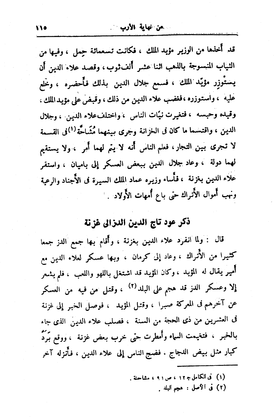 قد أخذها من الوزير مؤيد الملك، فكانت تسعمائة حمل، وفيها من الثياب المنسوجة بالذهب اثنا عشر ألف ثوب، وقصد علاء الدين أن يستوزر مؤيّد الملك، فسمع جلال الدين بذلك فأحضره، وخلع عليه، واستوزره، فغضب علاء الدين من ذلك، وقبض على مؤيد الملك، وقيده وحبسه، فتغيرت نيّات الناس، واختلف علاء الدين، وجلال الدين، واقتسما ما كان في الخزانة وجرى بينهما مشاحّة «1» فى القسمة لا تجرى بين التجار، فعلم الناس أنه لا يتم لهما أمر، ولا يستقيم لهما دولة، وعاد جلال الدين ببعض العسكر إلى باميان، واستقر علاء الدين بغزنة، فأساء وزيره عماد الملك السيرة في الأجناد والرعية ونهب أموال الأتراك حتى باع أمهات الأولاد.