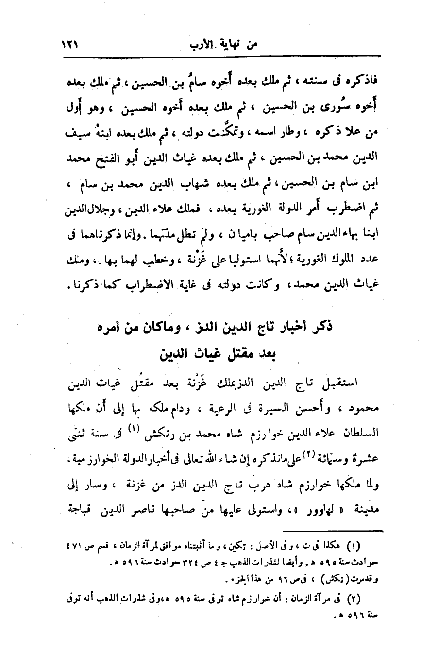 استقبل تاج الدين الدز بملك غزنة بعد مقتل غياث الدين محمود، وأحسن السيرة في الرعية، ودام ملكه بها إلى أن ملكها السلطان علاء الدين خوارزم شاه محمد بن رتكش «1» فى سنة ثنتى عشرة وستمائة «2» على ما نذكره إن شاء الله تعالى في أخبار الدولة الخوارزمية، ولما ملكها خوارزم شاه هرب تاج الدين الدز من غزنة، وسار إلى مدينة «لهاوور» ، واستولى عليها من صاحبها ناصر الدين قباجة