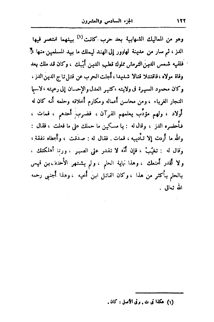 والله ما أردت إلا تأديبه، فمات. فقال له: صدقت، وأعطاه نفقة، وقال له: تغيّب، فإن أمّه لا تقدر على الصبر، وربما أهلكتك، ولا أقدر أمنعك، وهذا نهاية الحلم، ولم يشتهر الأحنف بن قيس بالحلم بأكثر من هذا، وكان القاتل ابن أخيه، وهذا أجنبى رحمه الله تعالى.