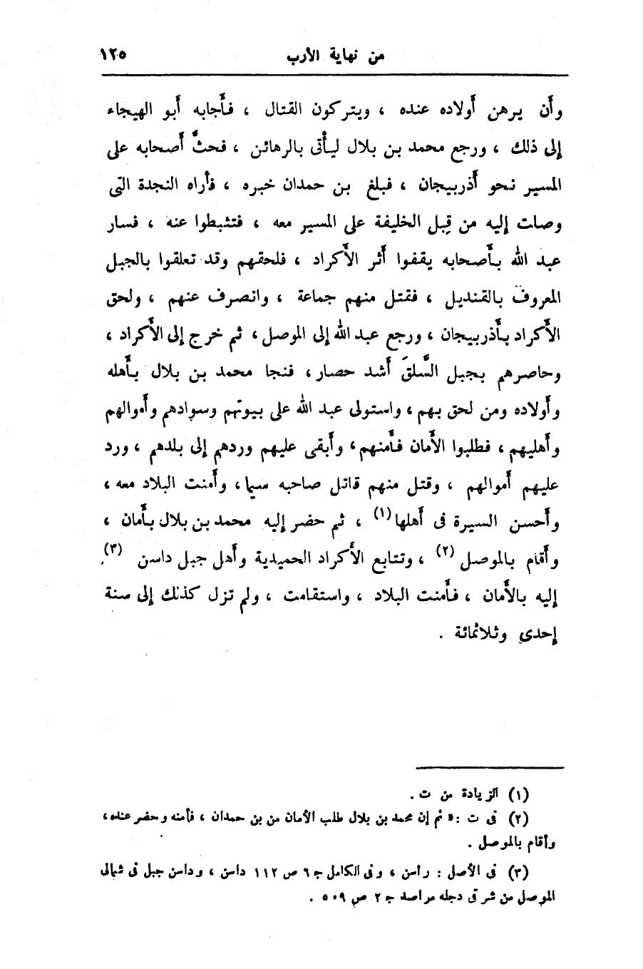 وأن يرهن أولاده عنده، ويتركون القتال، فأجابه أبو الهيجاء إلى ذلك، ورجع محمد بن بلال ليأتى بالرهائن، فحثّ أصحابه على المسير نحو أذربيجان، فبلغ بن حمدان خبره، فأراه النجدة التى وصلت إليه من قبل الخليفة على المسير معه، فتثبطوا عنه، فسار عبد الله بأصحابه يقفوا أثر الأكراد، فلحقهم وقد تعلقوا بالجبل المعروف بالقنديل، فقتل منهم جماعة، وانصرف عنهم، ولحق الأكراد بأذربيجان، ورجع عبد الله إلى الموصل، ثم خرج إلى الأكراد، وحاصرهم بجبل السّلق أشد حصار، فنجا محمد بن بلال بأهله وأولاده ومن لحق بهم، واستولى عبد الله على بيوتهم وسوادهم وأموالهم وأهليهم، فطلبوا الأمان فأمنهم، وأبقى عليهم وردهم إلى بلدهم، ورد عليهم أموالهم، وقتل منهم قاتل صاحبه سيما، وأمنت البلاد معه، وأحسن السيرة في أهلها «1» ، ثم حضر إليه محمد بن بلال بأمان، وأقام بالموصل «2» ، وتتابع الأكراد الحميدية وأهل جبل داسن «3» إليه بالأمان، فأمنت البلاد، واستقامت، ولم تزل كذلك إلى سنة إحدى وثلاثمائة.