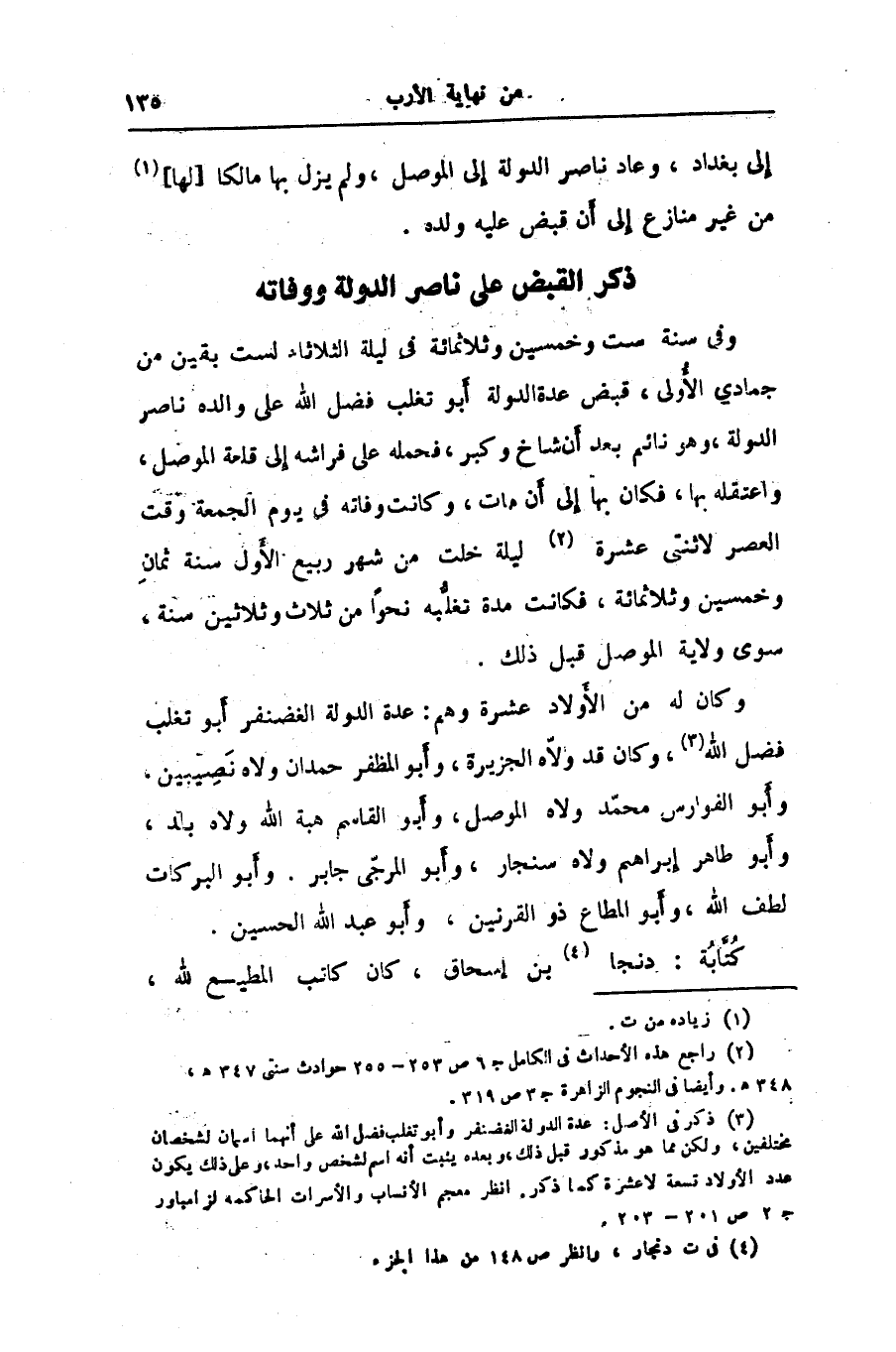 وفي سنة ست وخمسين وثلاثمائة في ليلة الثلاثاء لست بقين من جمادي الأولى، قبض عدة الدولة أبو تغلب فضل الله على والده ناصر الدولة، وهو نائم بعد أن شاخ وكبر، فحمله على فراشه إلى قلعة الموصل، واعتقله بها، فكان بها إلى أن مات، وكانت وفاته في يوم الجمعة وقت العصر لاثنتى عشرة «2» ليلة خلت من شهر ربيع الأول سنة ثمان وخمسين وثلاثمائة، فكانت مدة تغلّبه نحوا من ثلاث وثلاثين سنة، سوى ولاية الموصل قبل ذلك.
