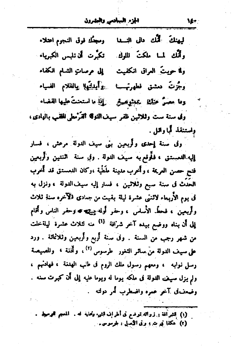 وفي سنة إحدى وأربعين بنى سيف الدولة مرعش، فسار إليه الدمستق، فأوقع به سيف الدولة. وفي سنة اثنتين وأربعين فتح حصن العريمة، وأخرب مدينة ملطية، وكان الدمستق قد أخرب الحدث في سنة سبع وثلاثين، فسار إليه سيف الدولة، ونزل به فى يوم الأربعاء لاثنتى عشرة ليلة بقيت من جمادى الآخره سنة ثلاث وأربعين، فحط الأساس، وحفر أوله بيده، وحفر الناس وأقام إلى أن بناه ووضع بيده آخر شرافة «1» منه لثلاث عشرة ليلة خلت من شهر رجب من السنة. وفي سنة أربع وأربعين وثلاثمائة. ورد على سيف الدولة من سائر الثغور طرسوس «2» ، وأذنة، والمصيصة رسل نوابه، ومعهم رسول ملك الروم في طلب الهدنة، فهادنهم، ولم يزل سيف الدولة في ملكه يوما له ويوما عليه إلى أن كبرت سنه.