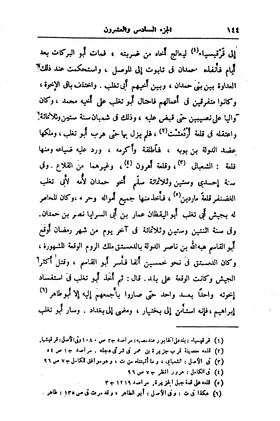 إلى قرقيسياء «1» ليعالج أخاه من ضربته، فمات أبو البركات بعد أيام فأنفذه حمدان في تابوت إلى الموصل، واستحكمت عند ذلك العداوة بين بنى حمدان، وبين أخيهم أبى تغلب. واختلف باقى الإخوة، وكانوا متفرقين في أعمالهم فاحتال أبو تغلب على أخيه محمد، وكان واليا على نصيبين حتى قبض عليه، وذلك في شعبان سنة ستين وثلاثمائة واعتقله في قلعة أردمشت «2» ، فلم يزل بها حتى هرب أبو تغلب، وملكها عضد الدولة بن بوبه، فاطلقة وأكرمه، ورد عليه ضياعه ومنها قلعة: الشعبانى «3» ، وقلعة أهرون «4» ، وغيرهما من القلاع. وفي سنة إحدى وستين وثلاثمائة سلم أخو حمدان لأمه لأبى تغلب الغضنفر قلعة ماردين «5» ، فأخذ منها جميع أمواله وحر؟؟؟ هـ، وكان المحاصر له بجيش أبى تغلب أبو اليقظان عمار بن أبى السرايا نصر بن حمدان.