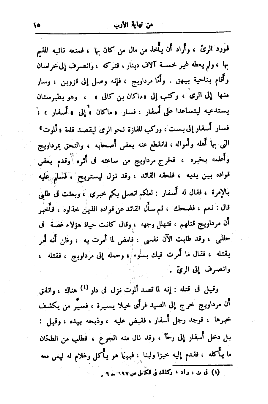 فورد الرىّ، وأراد أن يأخذ من مال من كان بها، فمنعه نائبه المقيم بها، ولم يعطه غير خمسة آلاف دينار، فتركه، وانصرف إلى خراسان وأقام بناحية بيهق. وأمّا مرداويج، فإنه وصل إلى قزوين، وسار منها إلى الرى، وكتب إلى «ماكان بن كالى» ، وهو بطبرستان يستدعيه ليتساعدا على أسفار، فسار «ماكان» إلى «أسفار» ، فسار أسفار إلى بست، وركب المفازة نحو الرى ليقصد قلعة «ألموت» التى بها أهله وأمواله، فانقطع عنه بعض أصحابه، والتحق بمرداويج وأعلمه بخبره، فخرج مرداويج من ساعته في أثره وقدم بعض قواده بين يديه، فلحقه القائد، وقد نزل ليستريح، فسلم عليه بالإمرة، فقال له أسفار: لعلكم اتصل بكم خبرى، وبعثت في طلبى قال: نعم، فضحك، ثم سأل القائد عن قواده الذين خذلوه، فأخبر أن مرداويج قتلهم، فتهلل وجهه، وقال كانت حياة هؤلاء غصة في حلقى، وقد طابت الآن نفسى، فامض لما أمرت به، وظن أنّه أمر بقتله، فقال ما أمرت فيك بسوء، وحمله إلى مرداويج، فقتله، وانصرف إلى الرىّ.