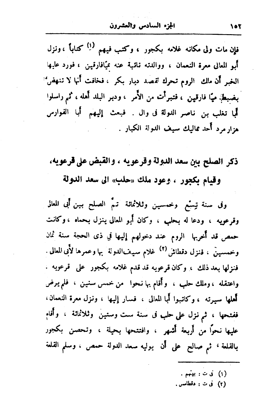 ذكر الصلح بين سعد الدولة وقرعويه، والقبض على قرعويه، وقيام بكجور، وعود ملك «حلب» الى سعد الدولة
