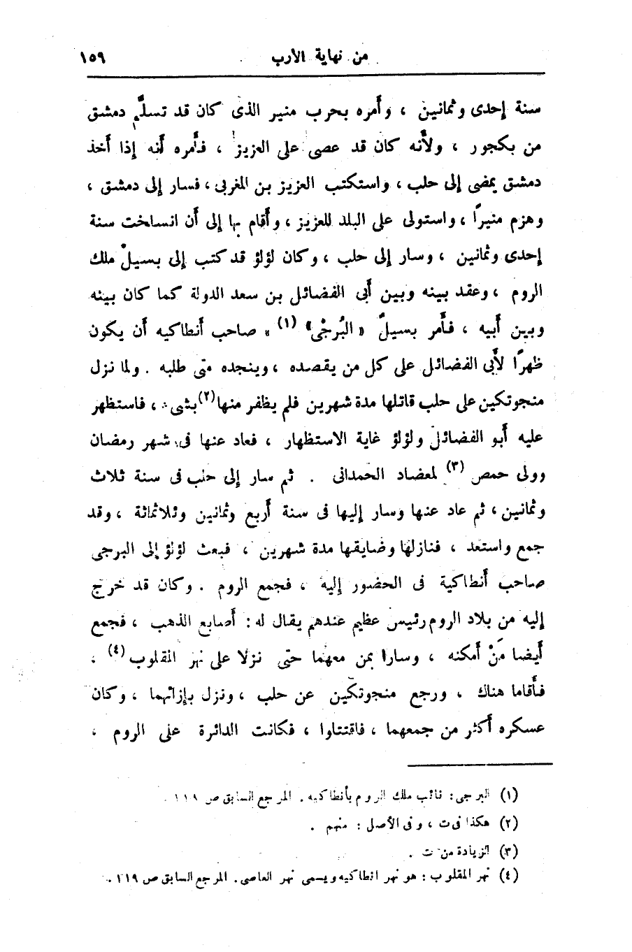 سنة إحدى وثمانين، وأمره بحرب منير الذى كان قد تسلّم دمشق من بكجور، ولأنه كان قد عصى على العزيز، فأمره أنه إذا أخذ دمشق يمضى إلى حلب، واستكتب العزيز بن المغربى، فسار إلى دمشق، وهزم منيرا، واستولى على البلد للعزيز، وأقام بها إلى أن انسلخت سنة إحدى وثمانين، وسار إلى حلب، وكان لؤلؤ قد كتب إلى بسيل ملك الروم، وعقد بينه وبين أبى الفضائل بن سعد الدولة كما كان بينه وبين أبيه، فأمر بسيل «البرجى» «1» » صاحب أنطاكيه أن يكون ظهرا لأبى الفضائل على كل من يقصده، وينجده متى طلبه. ولما نزل منجوتكين على حلب قاتلها مدة شهرين فلم يظفر منها «2» بشىء، فاستظهر عليه أبو الفضائل ولؤلؤ غاية الاستظهار، فعاد عنها في شهر رمضان وولى حمص «3» لمعضاد الحمدانى. ثم سار إلى حلب في سنة ثلاث وثمانين، ثم عاد عنها وسار إليها في سنة أربع وثمانين وثلاثمائة، وقد جمع واستعد، فنازلها وضايقها مدة شهرين، فبعث لؤلؤ إلى البرجى صاحب أنطاكية في الحضور إليه، فجمع الروم. وكان قد خرج إليه من بلاد الروم رئيس عظيم عندهم يقال له: أصابع الذهب، فجمع أيضا من أمكنه، وسارا بمن معهما حتى نزلا على نهر المقلوب «4» ، فأقاما هناك، ورجع منجوتكين عن حلب، ونزل بإزائهما، وكان عسكره أكثر من جمعهما، فاقتتلوا، فكانت الدائرة على الروم،