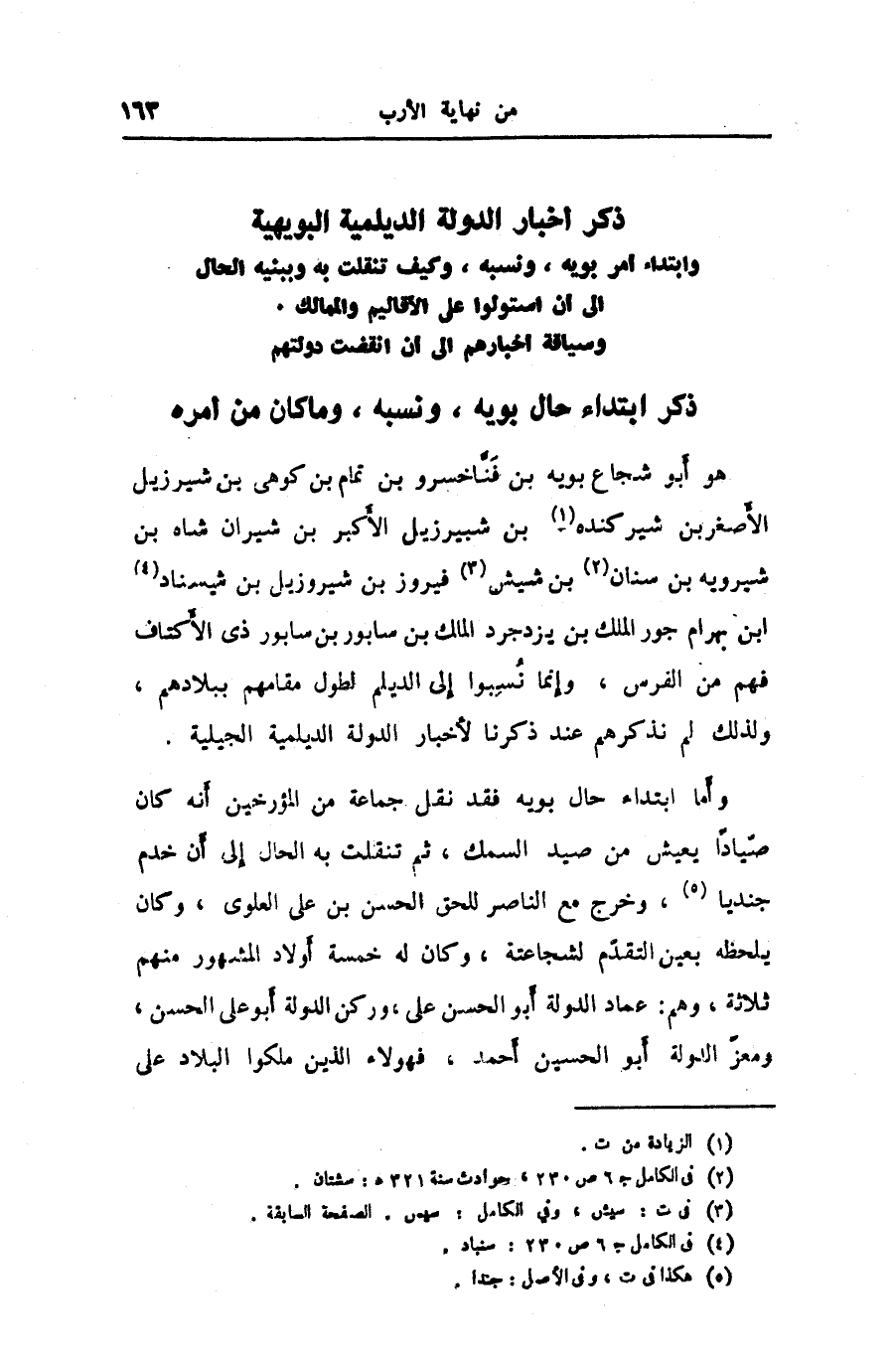 وأما ابتداء حال بويه فقد نقل جماعة من المؤرخين أنه كان صيّادا يعيش من صيد السمك، ثم تنقلت به الحال إلى أن خدم جنديا «5» ، وخرج مع الناصر للحق الحسن بن على العلوى، وكان يلحظه بعين التقدّم لشجاعتة، وكان له خمسة أولاد المشهور منهم ثلاثة، وهم: عماد الدولة أبو الحسن على، وركن الدولة أبو على الحسن، ومعزّ الدولة أبو الحسين أحمد، فهولاء الذين ملكوا البلاد على