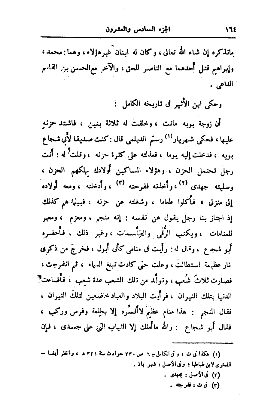 أن زوجة بويه ماتت، وخلفت له ثلاثة بنين، فاشتد حزنه عليها، فحكى شهريار «1» رستم الديلمى قال: كنت صديقا لأبى شجاع بويه، فدخلت إليه يوما، فعذلته على كثرة حزنه، وقلت له: أنت رجل تحتمل الحزن، وهؤلاء المساكين أولادك يهلكهم الحزن، وسليته جهدى «2» ، وأخذته ففرحته «3» ، وأدخلته، ومعه أولاده إلى منزلى، فأكلوا طعاما، وشغلته عن حزنه، فبينما هم كذلك إذ اجتاز بنا رجل يقول عن نفسه: إنه منجم، ومعزم، ومعبر للمنامات، ويكتب الرّقى والطلّسمات، وغير ذلك، فأحضره أبو شجاع، وقال له: رأيت في منامى كأنى أبول، فخرج من ذكرى نار عظيمة استطالت، وعلت حتى كادت تبلغ السماء، ثم انفرجت، فصارت ثلاث شعب، وتولّد من تلك الشعب عدة شعب، فأضاءت الدنيا بتلك النيران، فرأيت البلاد والعباد خاضعين لتلك النيران، فقال المنجم: هذا منام عظيم لا أفسّره إلا بخلعة وفرس وركب، فقال أبو شجاع: والله ما أملك إلا الثياب التى على جسدى، فإن