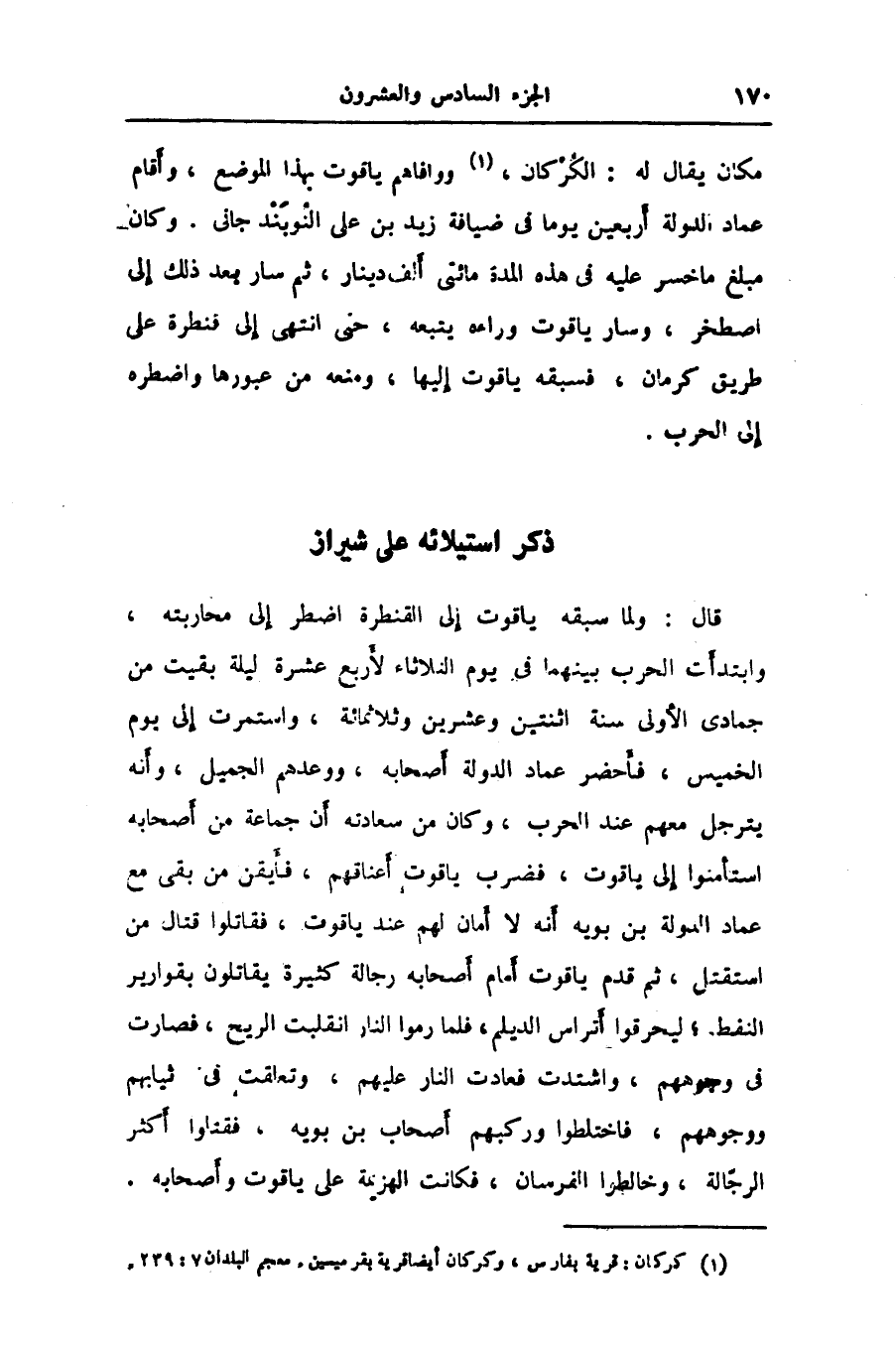 مكان يقال له: الكركان، «1» ووافاهم ياقوت بهذا الموضع، وأقام عماد الدولة أربعين يوما في ضيافة زيد بن على النوبندجانى. وكان مبلغ ما خسر عليه في هذه المدة مائتى ألف دينار، ثم سار بعد ذلك إلى اصطخر، وسار ياقوت وراءه يتبعه، حتى انتهى إلى قنطرة على طريق كرمان، فسبقه ياقوت إليها، ومنعه من عبورها واضطره إلى الحرب.