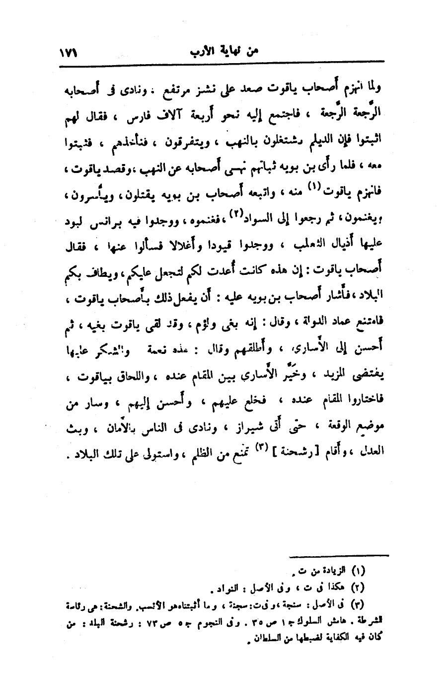 ولما انهزم أصحاب ياقوت صعد على نشز مرتفع، ونادى في أصحابه الرّجعة الرّجعة، فاجتمع إليه نحو أربعة آلاف فارس، فقال لهم اثبتوا فإن الديلم يشتغلون بالنهب، ويتفرقون، فنأخذهم، فثبتوا معه، فلما رأى بن بويه ثباتهم نهى أصحابه عن النهب، وقصد ياقوت، فانهزم ياقوت «1» منه، واتبعه أصحاب بن بويه يقتلون، ويأسرون، ويغنمون، ثم رجعوا إلى السواد «2» ، فغنموه، ووجدوا فيه برانس لبود عليها أذيال الثعلب، ووجدوا قيودا وأغلالا فسألوا عنها، فقال أصحاب ياقوت: إن هذه كانت أعدت لكم لتجعل عليكم، ويطاف بكم البلاد، فأشار أصحاب بن بويه عليه: أن يفعل ذلك بأصحاب ياقوت، فامتنع عماد الدولة، وقال: إنه بغى ولؤم، وقد لقى ياقوت بغيه، ثم أحسن إلى الأسارى، وأطلقهم وقال: هذه نعمة والشكر عليها يقتضى المزيد، وخيّر الأسارى بين المقام عنده، واللحاق بياقوت، فاختاروا المقام عنده، فخلع عليهم، وأحسن إليهم، وسار من موضع الوقعة، حتى أتى شيراز، ونادى في الناس بالأمان، وبث العدل، وأقام [رشحنة] «3» تمنع من الظلم، واستولى على تلك البلاد.
