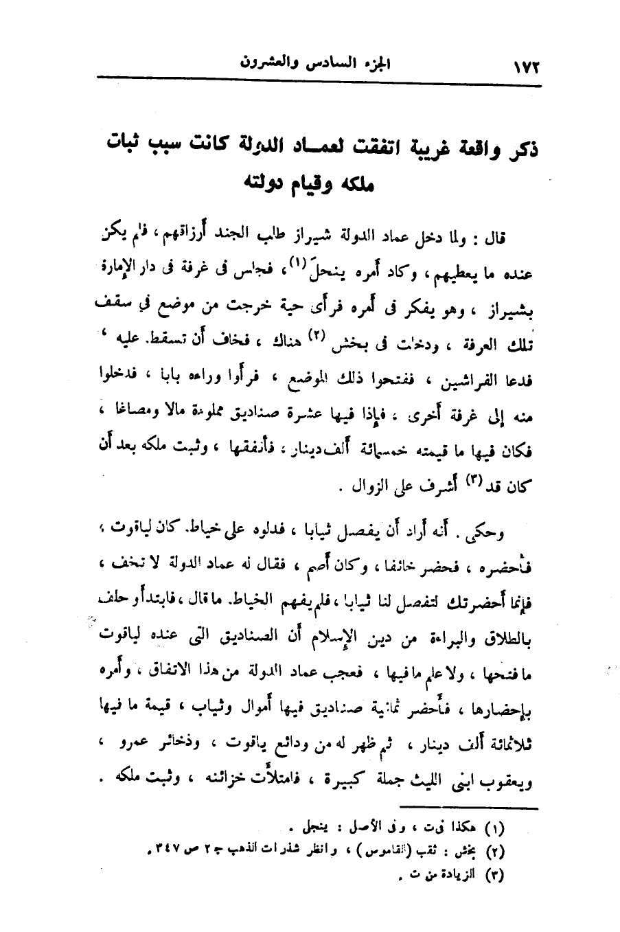 قال: ولما دخل عماد الدولة شيراز طلب الجند أرزاقهم، فلم يكن عنده ما يعطيهم، وكاد أمره ينحل «1» ، فجلس في غرفة في دار الإمارة بشيراز، وهو يفكر في أمره فرأى حية خرجت من موضع في سقف تلك العرفة، ودخلت في بخش «2» هناك، فخاف أن تسقط عليه، فدعا الفراشين، ففتحوا ذلك الموضع، فرأوا وراءه بابا، فدخلوا منه إلى غرفة أخرى، فإذا فيها عشرة صناديق مملوءة مالا ومصاغا، فكان فيها ما قيمته خمسمائة ألف دينار، فأنفقها، وثبت ملكه بعد أن كان قد «3» أشرف على الزوال.
