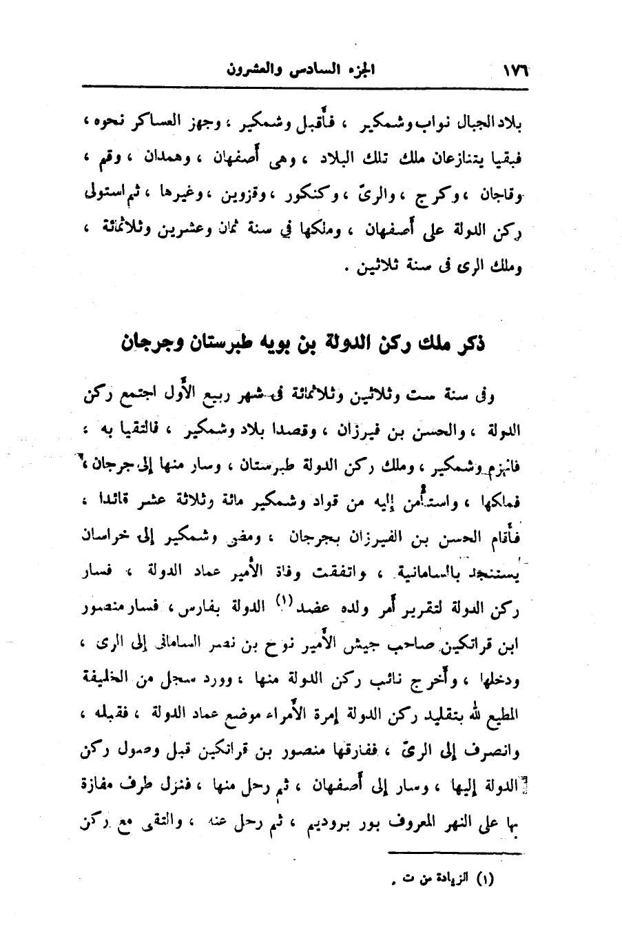 وفي سنة ست وثلاثين وثلاثمائة في شهر ربيع الأول اجتمع ركن الدولة، والحسن بن فيرزان، وقصدا بلاد وشمكير، فالتقيا به، فانهزم وشمكير، وملك ركن الدولة طبرستان، وسار منها إلى جرجان، فملكها، واستأمن إليه من قواد وشمكير مائة وثلاثة عشر قائدا، فأقام الحسن بن الفيرزان بجرجان، ومضى وشمكير إلى خراسان يستنجد بالسامانية، واتفقت وفاة الأمير عماد الدولة، فسار ركن الدولة لتقرير أمر ولده عضد «1» الدولة بفارس، فسار منصور ابن قراتكين صاحب جيش الأمير نوح بن نصر السامانى إلى الرى، ودخلها، وأخرج نائب ركن الدولة منها، وورد سجل من الخليفة المطيع لله بتقليد ركن الدولة إمرة الأمراء موضع عماد الدولة، فقبله، وانصرف إلى الرىّ، ففارقها منصور بن قراتكين قبل وصول ركن الدولة إليها، وسار إلى أصفهان، ثم رحل منها، فنزل طرف مفازة بها على النهر المعروف بور بروديم، ثم رحل عنه، والتقى مع ركن