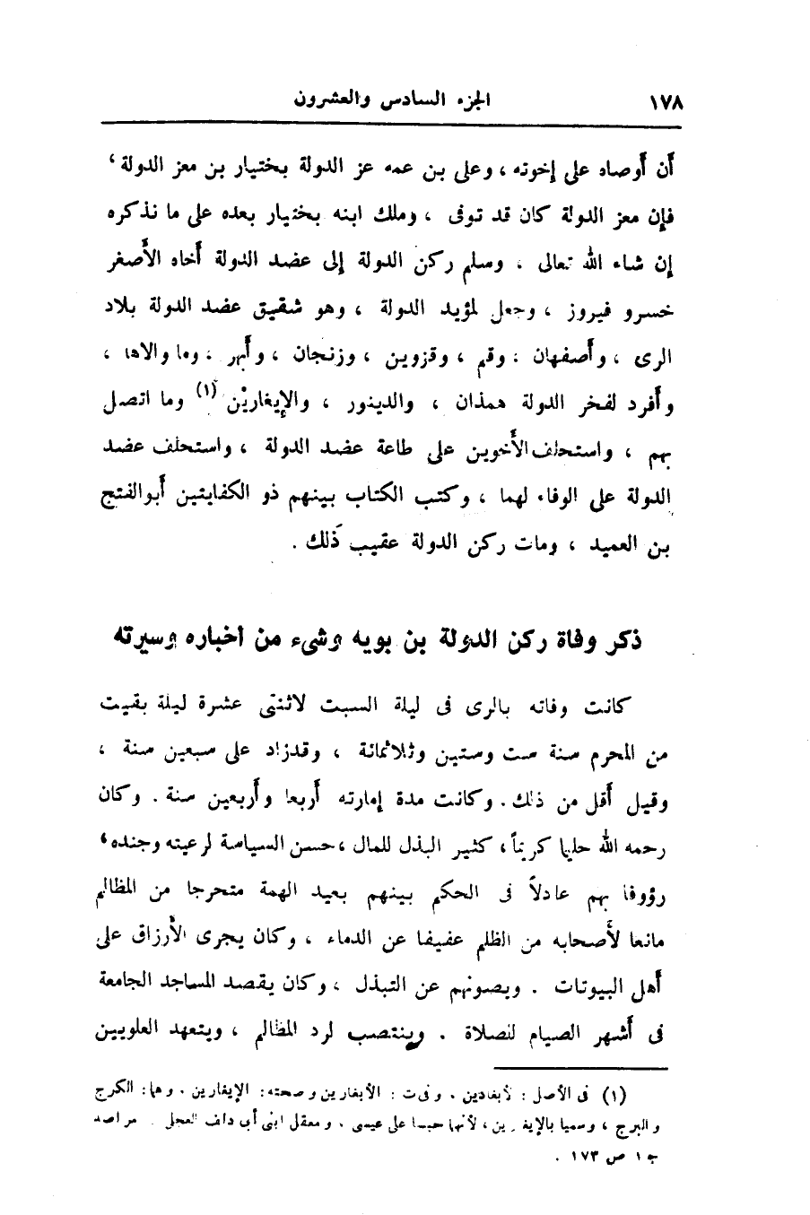 أن أوصاه على إخوته، وعلى بن عمه عز الدولة بختيار بن معز الدولة، فإن معز الدولة كان قد توفى، وملك ابنه بختيار بعده على ما نذكره إن شاء الله تعالى، وسلم ركن الدولة إلى عضد الدولة أخاه الأصغر خسرو فيروز، وجعل لمؤيد الدولة، وهو شقيق عضد الدولة بلاد الرى، وأصفهان، وقم، وقزوين، وزنجان، وأبهر، وما والاها، وأفرد لفخر الدولة همذان، والدينور، والإيغارين «1» وما اتصل بهم، واستحلف الأخوين على طاعة عضد الدولة، واستحلف عضد الدولة على الوفاء لهما، وكتب الكتاب بينهم ذو الكفايتين أبو الفتح بن العميد، ومات ركن الدولة عقيب ذلك.