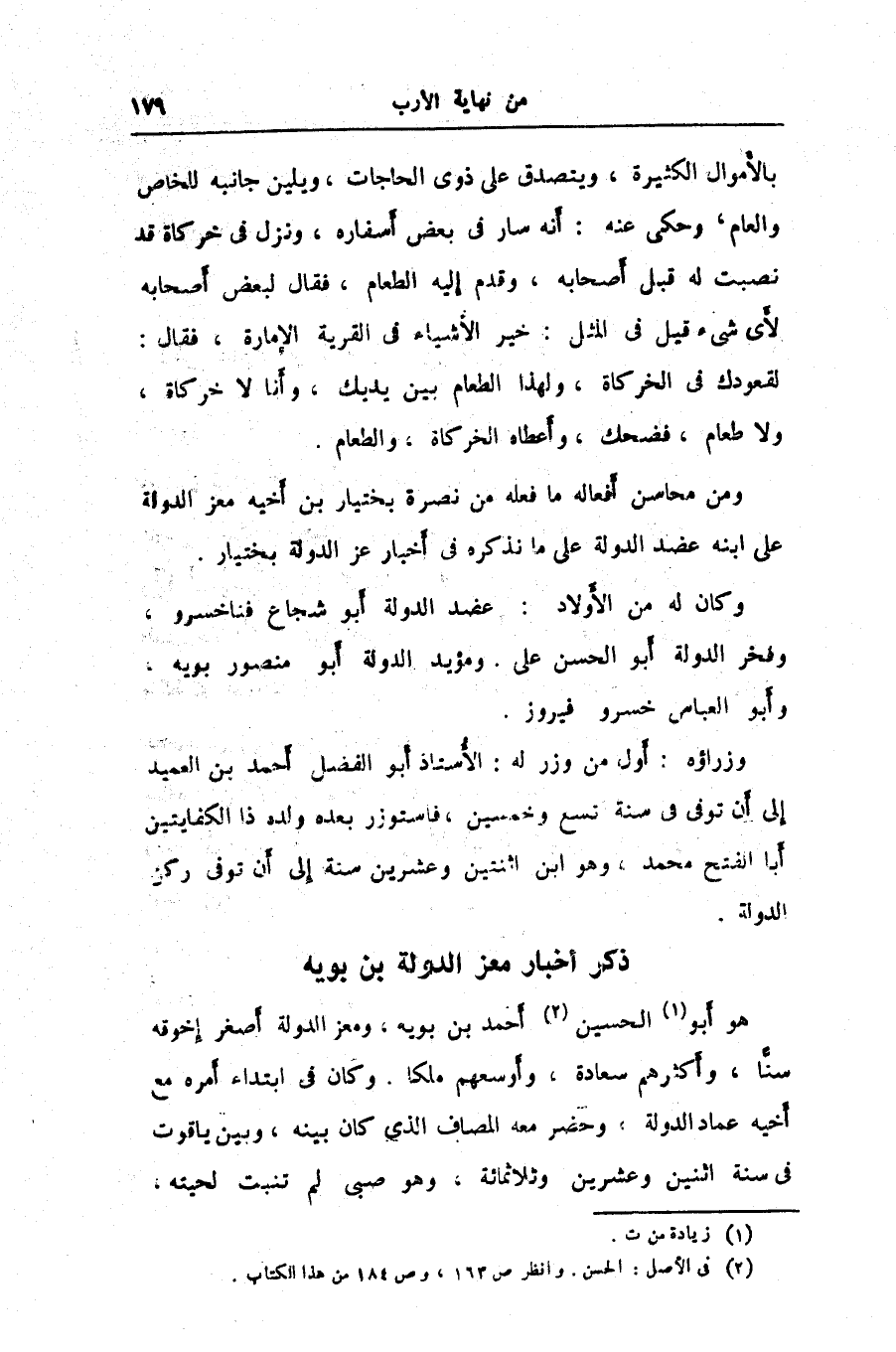 هو أبو «1» الحسين «2» أحمد بن بويه، ومعز الدولة أصغر إخوقه سنّا، وأكثرهم سعادة، وأوسعهم ملكا. وكان في ابتداء أمره مع أخيه عماد الدولة، وحضر معه المصاف الذى كان بينه، وبين ياقوت فى سنة اثنين وعشرين وثلاثمائة، وهو صبى لم تنبت لحيته،