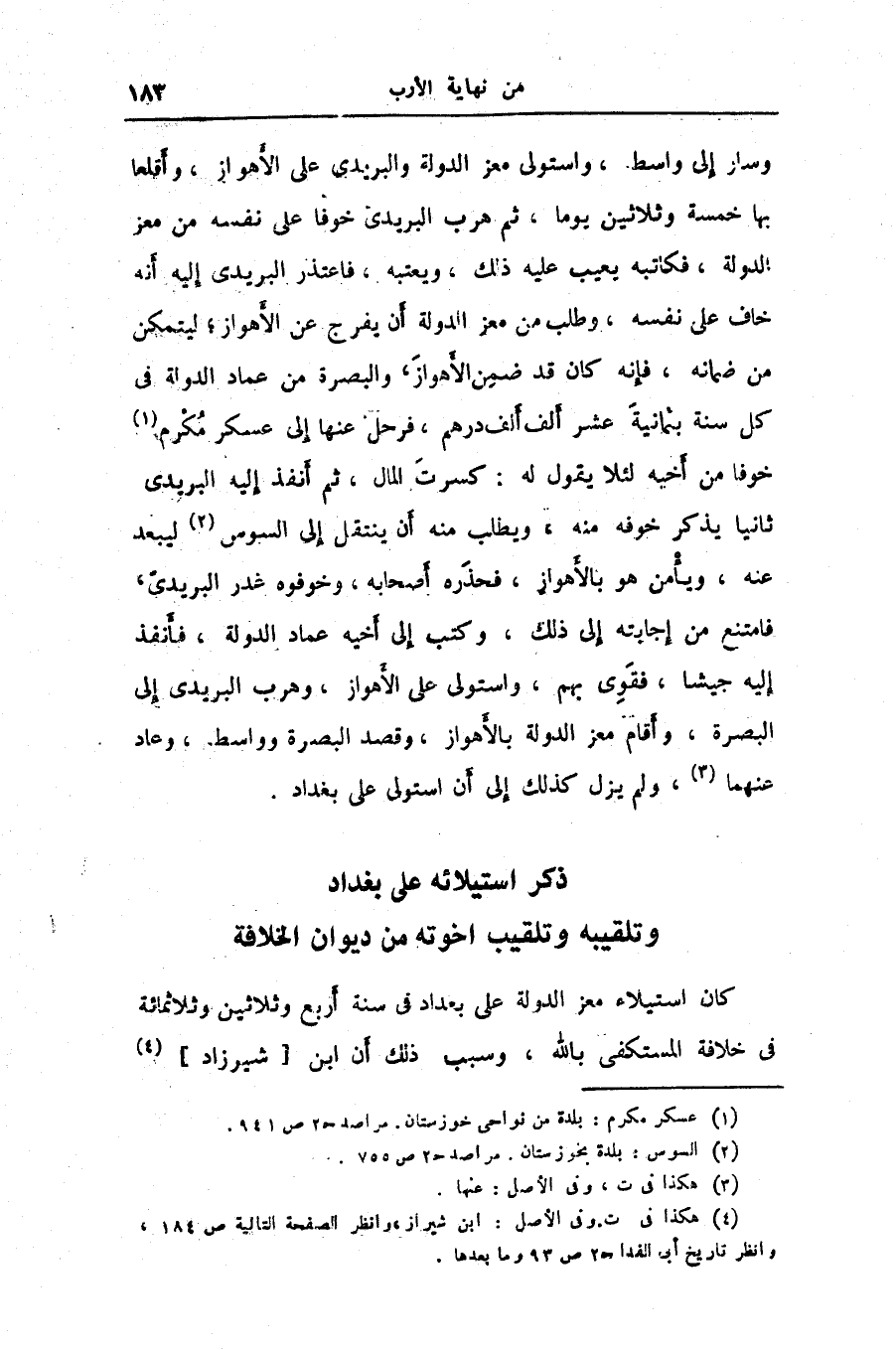 كان استيلاء معز الدولة على بغداد في سنة أربع وثلاثين وثلاثمائة فى خلافة المستكفى بالله، وسبب ذلك أن ابن [شيرزاد] «4»