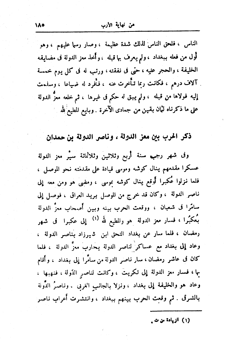 وفي شهر رجب سنة أربع وثلاثين وثلاثمائة سيّر معز الدولة عسكرا مقدمهم ينال كوشه وموسى قيادة على مقدمته نحو الموصل، فلما نزلوا عكبرا أوقع ينال كوشه بموسى، ومضى هو ومن معه إلى ناصر الدولة، وكان قد خرج من الموصل يريد العراق، فوصل إلى سامرّا في شعبان، ووقعت الحرب بينه وبين أصحاب معزّ الدولة بعكبرا، فسار معز الدولة هو والمطيع لله «1» إلى عكبرا في شهر رمضان، فلما سار عن بغداد التحق ابن شيرزاد بناصر الدولة، وعاد إلى بغداد مع عساكر لناصر الدولة يحارب معزّ الدولة، فلما كان في عاشر رمضان، سار ناصر الدولة من سامرّا إلى بغداد، وأقام بها، فسار معز الدولة إلى تكريت، وكانت لناصر الدّولة، فنهبها، وعاد هو والخليفة إلى بغداد، ونزلا بالجانب الغربى، وناصر الدّولة بالشرقى. ثم وقعت الحرب بينهم ببغداد، وانتشرت أعراب ناصر