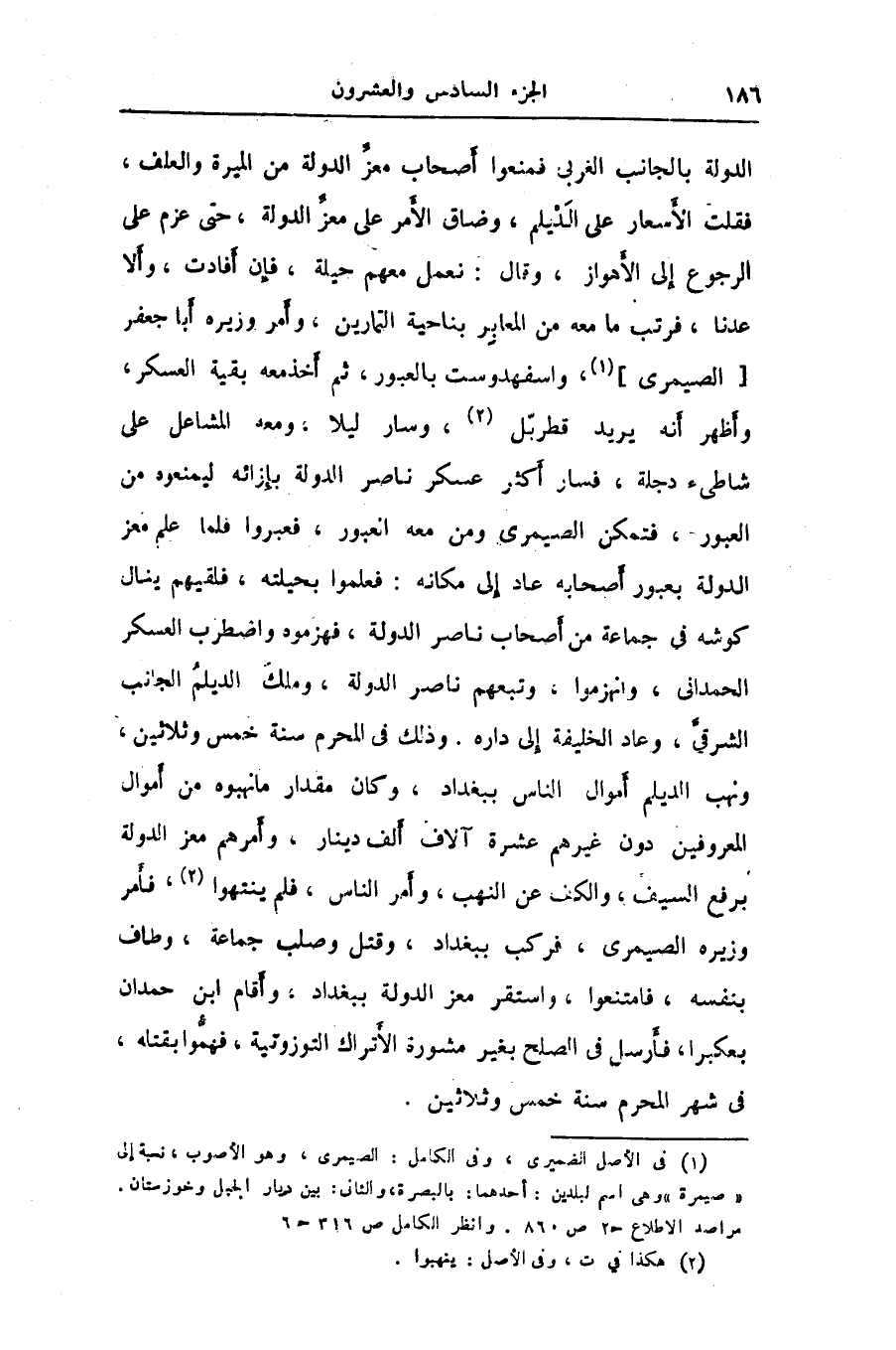 الدولة بالجانب الغربى فمنعوا أصحاب معزّ الدولة من الميرة والعلف، فقلت الأسعار على الديلم، وضاق الأمر على معزّ الدولة، حتى عزم على الرجوع إلى الأهواز، وقال: نعمل معهم حيلة، فإن أفادت، وألا عدنا، فرتب ما معه من المعابر بناحية التمارين، وأمر وزيره أبا جعفر [الصيمرى] «1» ، واسفهدوست بالعبور، ثم أخذ معه بقية العسكر، وأظهر أنه يريد قطربّل «2» ، وسار ليلا، ومعه المشاعل على شاطىء دجلة، فسار أكثر عسكر ناصر الدولة بإزائه ليمنعوه من العبور، فتمكن الصيمرى ومن معه العبور، فعبروا فلما علم معز الدولة بعبور أصحابه عاد إلى مكانه: فعلموا بحيلته، فلقيهم ينال كوشه في جماعة من أصحاب ناصر الدولة، فهزموه واضطرب العسكر الحمدانى، وانهزموا، وتبعهم ناصر الدولة، وملك الديلم الجانب الشرقيّ، وعاد الخليفة إلى داره. وذلك في المحرم سنة خمس وثلاثين، ونهب الديلم أموال الناس ببغداد، وكان مقدار ما نهبوه من أموال المعروفين دون غيرهم عشرة آلاف ألف دينار، وأمرهم معز الدولة برفع السيف، والكف عن النهب، وأمر الناس، فلم ينتهوا «3» ، فأمر وزيره الصيمرى، فركب ببغداد، وقتل وصلب جماعة، وطاف بنفسه، فامتنعوا، واستقر معز الدولة ببغداد، وأقام ابن حمدان بعكبرا، فأرسل في الصلح بغير مشورة الأتراك التوزوتية، فهمّوا بقتله، فى شهر المحرم سنة خمس وثلاثين.