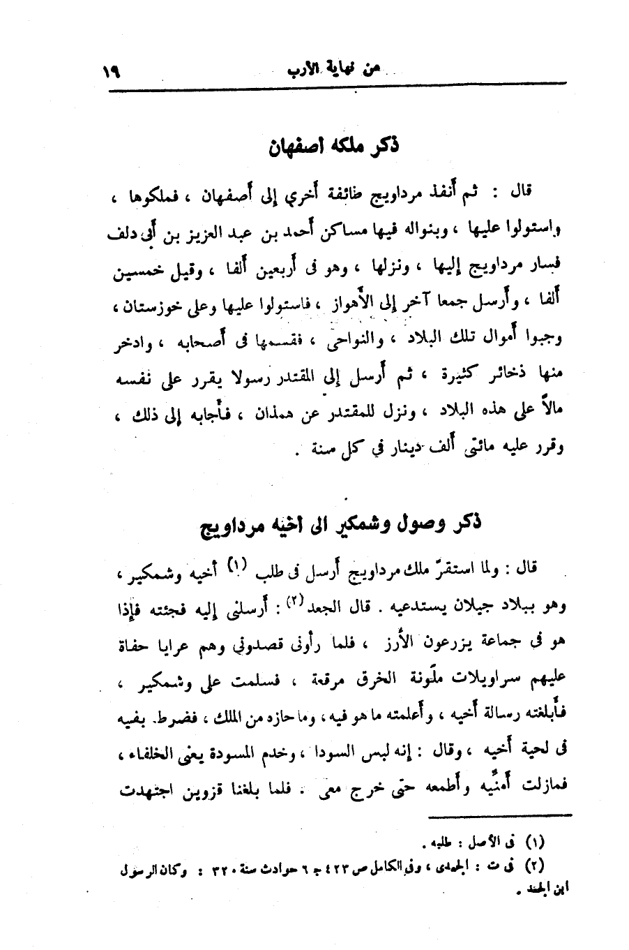 قال: ثم أنفذ مرداويج طائفة أخرى إلى أصفهان، فملكوها، واستولوا عليها، وبنوا له فيها مساكن أحمد بن عبد العزيز بن أبى دلف فسار مرداويج إليها، ونزلها، وهو في أربعين ألفا، وقيل خمسين ألفا، وأرسل جمعا آخر إلى الأهواز، فاستولوا عليها وعلى خوزستان، وجبوا أموال تلك البلاد، والنواحى، فقسمها في أصحابه، وادخر منها ذخائر كثيرة، ثم أرسل إلى المقتدر رسولا يقرر على نفسه مالا على هذه البلاد، ونزل للمقتدر عن همذان، فأجابه إلى ذلك، وقرر عليه مائتى ألف دينار في كل سنة.