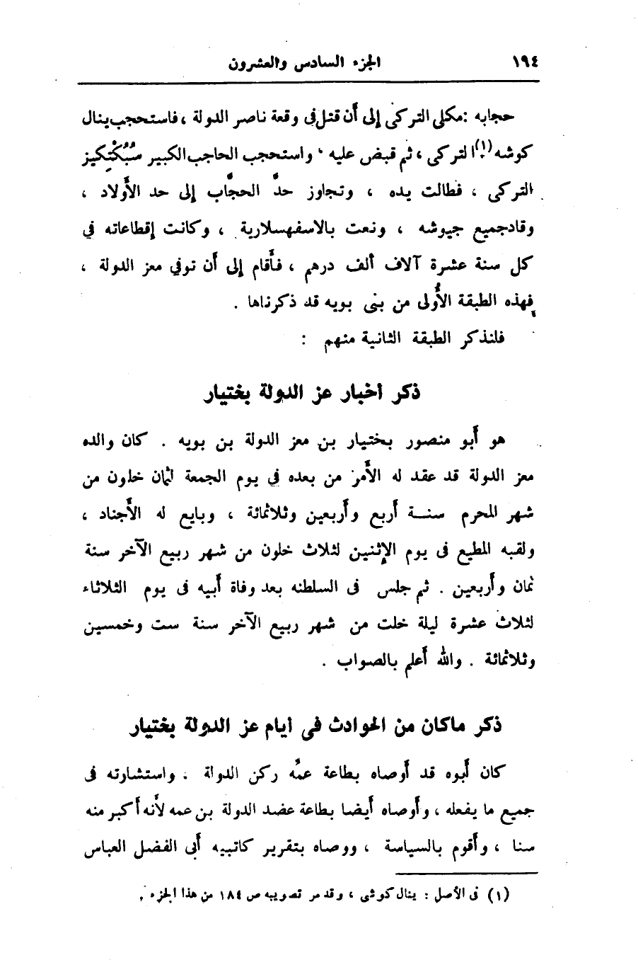 حجابه: مكلى التركى إلى أن قتل في وقعة ناصر الدولة، فاستحجب ينال كوشه «1» التركى، ثم قبض عليه، واستحجب الحاجب الكبير سبكتكيز التركى، فطالت يده، وتجاوز حدّ الحجّاب إلى حد الأولاد، وقاد جميع جيوشه، ونعت بالاسفهسلارية، وكانت إقطاعاته في كل سنة عشرة آلاف ألف درهم، فأقام إلى أن توفى معز الدولة، فهذه الطبقة الأولى من بنى بويه قد ذكرناها.