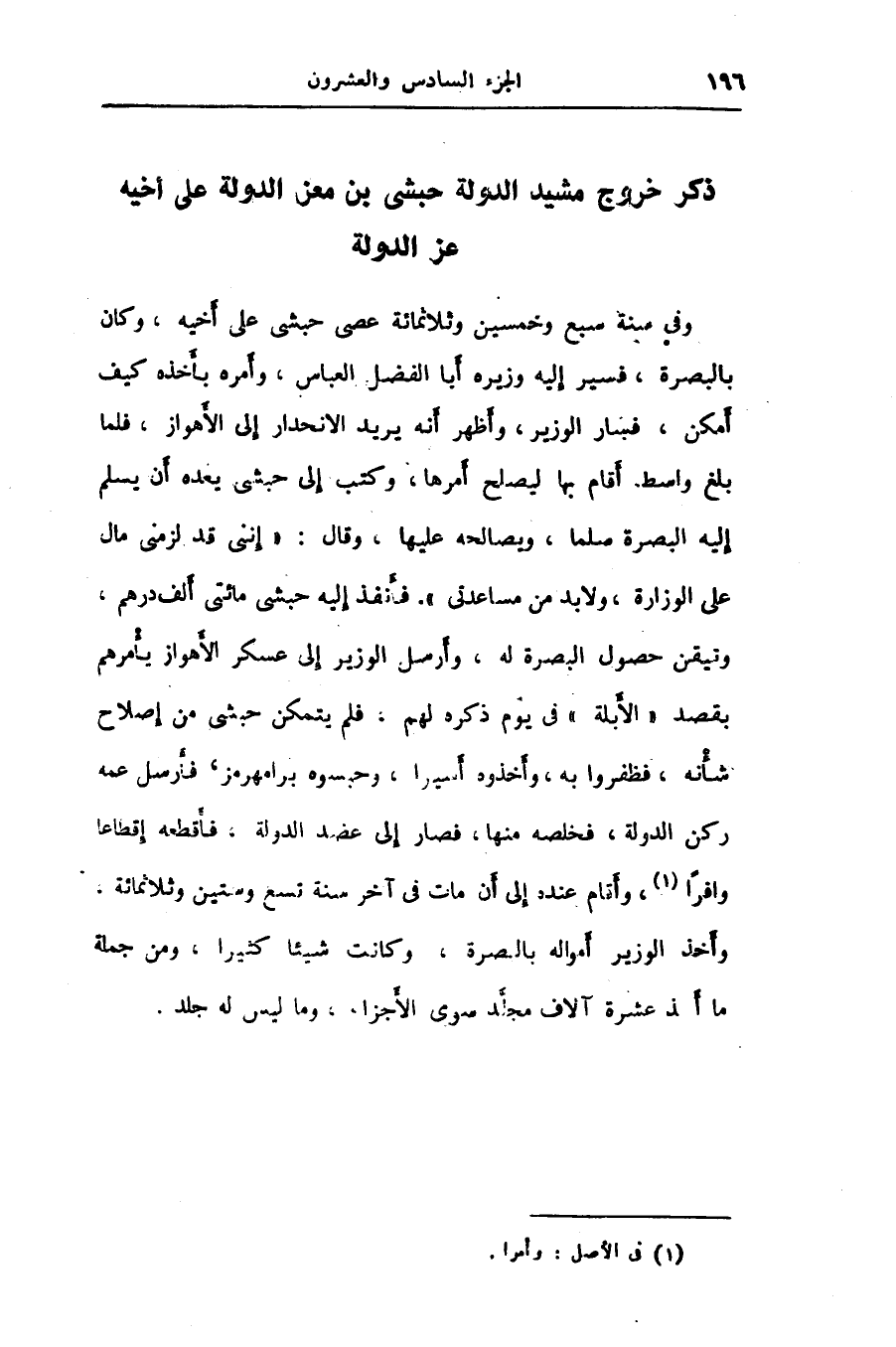 وفي سنة سبع وخمسين وثلاثمائة عصى حبشى على أخيه، وكان بالبصرة، فسير إليه وزيره أبا الفضل العباس، وأمره بأخذه كيف أمكن، فسار الوزير، وأظهر أنه يريد الانحدار إلى الأهواز، فلما بلغ واسط أقام بها ليصلح أمرها، وكتب إلى حبشى يعده أن يسلم إليه البصرة سلما، ويصالحه عليها، وقال: «إننى قد لزمنى مال على الوزارة، ولا بد من مساعدتى» . فأنفذ إليه حبشى مائتى ألف درهم، وتيقن حصول البصرة له، وأرسل الوزير إلى عسكر الأهواز يأمرهم بقصد «الأبلة» فى يوم ذكره لهم، فلم يتمكن حبشى من إصلاح شأنه، فظفروا به، وأخذوه أسيرا، وحبسوه برامهرمز، فأرسل عمه ركن الدولة، فخلصه منها، فصار إلى عضد الدولة، فأقطعه إقطاعا وافرا «1» ، وأقام عنده إلى أن مات في آخر سنة تسع وستين وثلاثمائة.