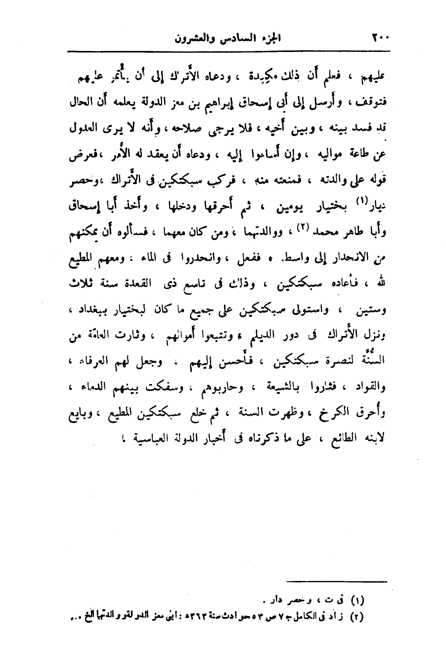 عليهم، فعلم أن ذلك مكيدة، ودعاه الأتراك إلى أن يأتمر عليهم فتوقف، وأرسل إلى أبى إسحاق إبراهيم بن معز الدولة يعلمه أن الحال قد فسد بينه، وبين أخيه، فلا يرجى صلاحه، وأنه لا يرى العدول عن طاعة مواليه، وإن أساءوا إليه، ودعاه أن يعقد له الأمر، فعرض قوله على والدته، فمنعته منه، فركب سبكتكين في الأتراك، وحصر ديار «1» بختيار يومين، ثم أحرقها ودخلها، وأخذ أبا إسحاق وأبا طاهر محمد «2» ، ووالدتهما، ومن كان معهما، فسألوه أن يمكنهم من الانحدار إلى واسط، ففعل، وانحدروا في الماء، ومعهم المطيع لله، فأعاده سبكتكين، وذلك في تاسع ذى القعدة سنة ثلاث وستين، واستولى سبكتكين على جميع ما كان لبختيار ببغداد، ونزل الأتراك في دور الديلم، وتتبعوا أموالهم، وثارت العامّة من السّنّة لنصرة سبكتكين، فأحسن إليهم، وجعل لهم العرفاء، والقواد، فثاروا بالشيعة، وحاربوهم، وسفكت بينهم الدماء، وأحرق الكرخ، وظهرت السنة، ثم خلع سبكتكين المطيع، وبايع لابنه الطائع، على ما ذكرناه في أخبار الدولة العباسية.