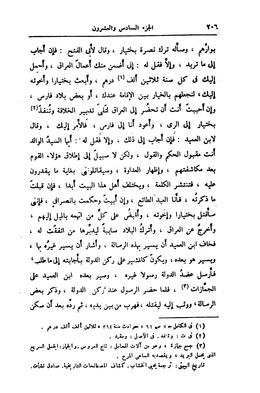 بوارهم، وسأله ترك نصرة بختيار، وقال لأبى الفتح: فإن أجاب إلى ما تريد، وإلّا فقل له: إنى أضمن منك أعمال العراق، وأحمل إليك في كل سنة ثلاثين ألف «1» درهم، وأبعث بختيارا وأخوته إليك، لنجعلهم بالخيار بين الإقامة عندك، أو بعض بلاد فارس، وإن أحببت أنت أن تحضر إلى العراق لتلى تدبير الخلافة وتنفذ «2» بختيار إلى الرى، وأعود أنا إلى فارس، فالأمر إليك، وقال لابن العميد: فإن أجاب إلى ذلك، وإلا فقل له: أيها السيد الوالد أنت مقبول الحكم والقول، ولكن لا سبيل إلى إطلاق هؤلاء القوم بعد مكاشفتهم، وإظهار العداوة، وسيقاتلوننى بغاية ما يقدرون عليه، فتنتشر الكلمة، ويختلف أهل هذا البيت أبدا، فإن قبلت ما ذكرته، فأنا العبد الطائع، وإن أبيت وحكمت بانصرافى، فإننى سأقتل بختيارا وإخوته، وأقبض على كلّ من اتهمه بالميل إليهم، وأخرج عن العراق، وأترك البلاد سايبة ليدبّرها من اتفقت له، فخاف ابن العميد أن يسير بهذه الرسالة، وأشار أن يسير غيره بها، ويسير هو بعده، ويكون كالمشير على ركن الدولة بأجابته إلى ما طلب، فأرسل عضد الدولة رسولا غيره، وسير بعده ابن العميد على الجمّازات «3» ، فلما حضر الرسول عند ركن الدولة، وذكر بعض الرسالة، ووثب إليه ليقتله، فهرب من بين يديه، ثم ردّه بعد أن سكن