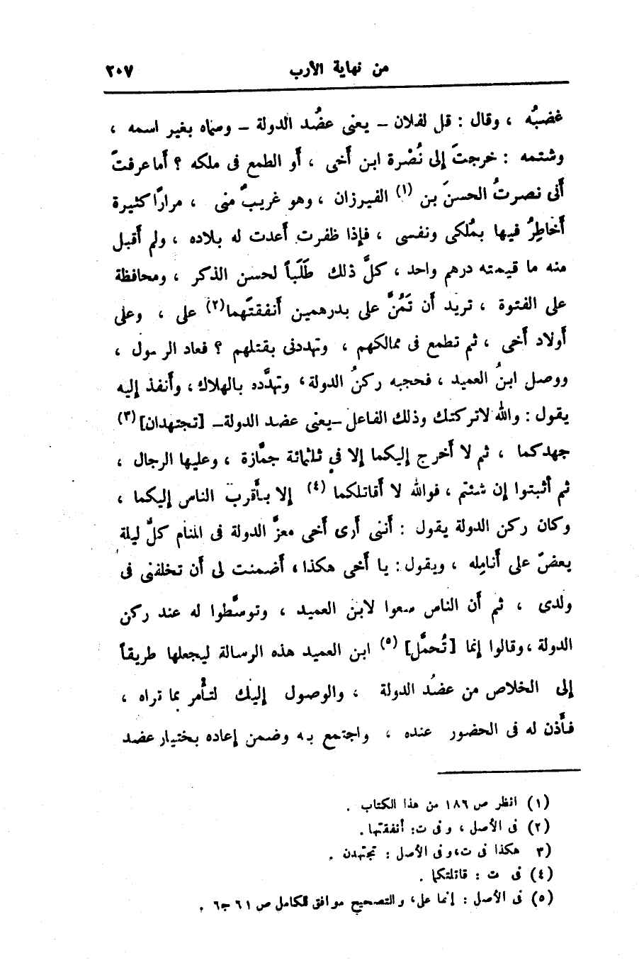غضبه، وقال: قل لفلان- يعنى عضد الدولة- وسماه بغير اسمه، وشتمه: خرجت إلى نصرة ابن أخى، أو الطمع في ملكه؟ أما عرفت أنى نصرت الحسن بن «1» الفيرزان، وهو غريب منى، مرارا كثيرة أخاطر فيها بملكى ونفسى، فإذا ظفرت أعدت له بلاده، ولم أقبل منه ما قيمته درهم واحد، كلّ ذلك طلبا لحسن الذكر، ومحافظة على الفتوة، تريد أن تمنّ على بدرهمين أنفقتهما «2» على، وعلى أولاد أخى، ثم تطمع في ممالكهم، وتهددنى بقتلهم؟ فعاد الرسول، ووصل ابن العميد، فحجبه ركن الدولة، وتهدّده بالهلاك، وأنفذ إليه يقول: والله لا تركتك وذلك الفاعل- يعنى عضد الدولة-[تجتهدان] «3» جهدكما، ثم لا أخرج إليكما إلا في ثلاثمائة جمّازة، وعليها الرجال، ثم أثبتوا إن شئتم، فو الله لا أقاتلكما «4» إلا بأقرب الناس إليكما، وكان ركن الدولة يقول: أننى أرى أخى معزّ الدولة في المنام كل ليلة يعضّ على أنامله، ويقول: يا أخى هكذا، أضمنت لى أن تخلفنى في ولدى، ثم أن الناس سعوا لابن العميد، وتوسّطوا له عند ركن الدولة، وقالوا إنما [تحمّل] «5» ابن العميد هذه الرسالة ليجعلها طريقا إلى الخلاص من عضد الدولة، والوصول إليك لتأمر بما تراه، فأذن له في الحضور عنده، واجتمع به وضمن إعاده بختيار عضد