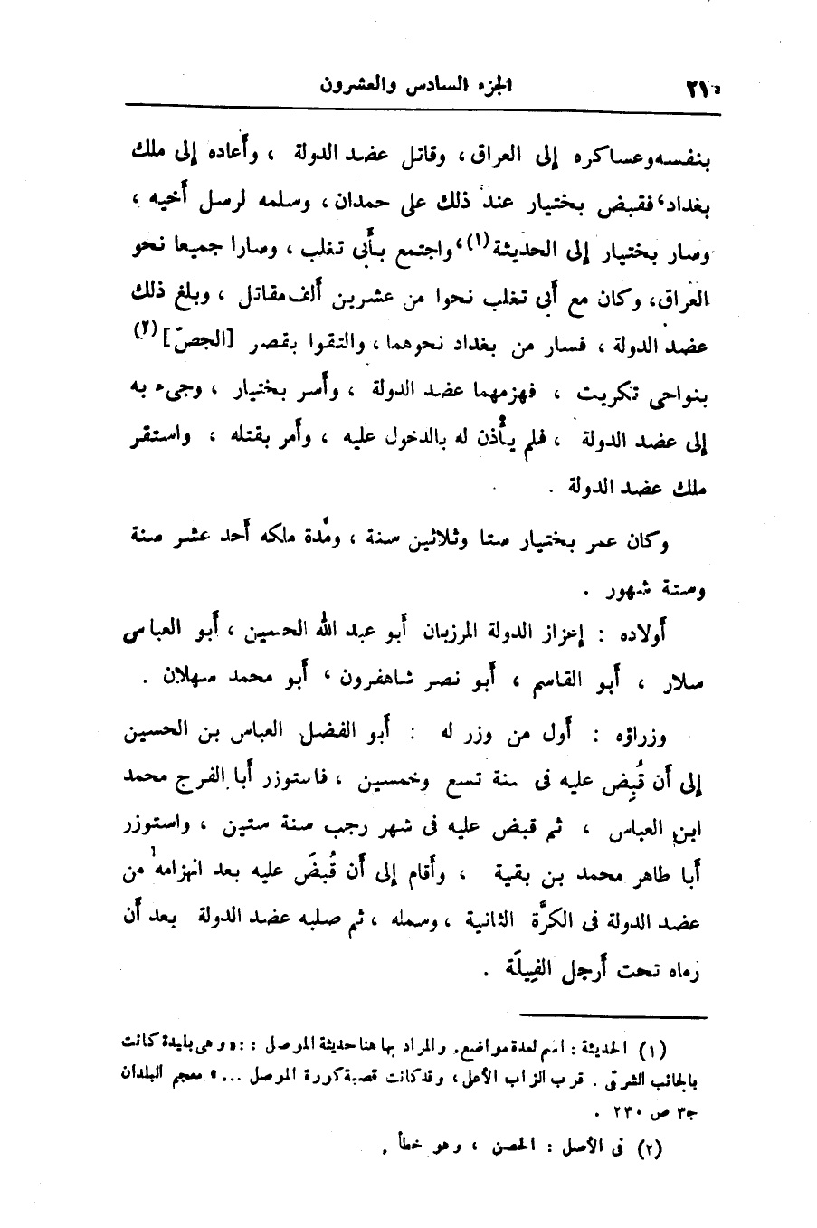 بنفسه وعساكره إلى العراق، وقاتل عضد الدولة، وأعاده إلى ملك بغداد، فقبض بختيار عند ذلك على حمدان، وسلمه لرسل أخيه، وسار بختيار إلى الحديثة «1» ، واجتمع بأبى تغلب، وسارا جميعا نحو العراق، وكان مع أبى تغلب نحوا من عشرين ألف مقاتل، وبلغ ذلك عضد الدولة، فسار من بغداد نحوهما، والتقوا بقصر [الجصّ] «2» بنواحى تكريت، فهزمهما عضد الدولة، وأسر بختيار، وجىء به إلى عضد الدولة، فلم يأذن له بالدخول عليه، وأمر بقتله، واستقر ملك عضد الدولة.