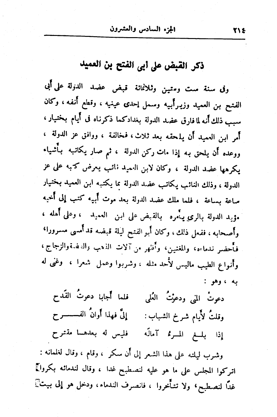 وفي سنة ست وستين وثلاثمائة قبض عضد الدولة على أبى الفتح بن العميد وزير أبيه وسمل إحدى عينيه، وقطع أنفه، وكان سبب ذلك أنه لما فارق عضد الدولة بغداد كما ذكرناه في أيام بختيار، أمر ابن العميد أن يلحقه بعد ثلاث، فخالفة، ووافق عز الدولة، ووعده أن يلحق به إذا مات ركن الدولة، ثم صار يكاتبه بأشياء يكرهها عضد الدولة، وكان لابن العميد نائب يعرض كتبه على عز الدولة، وذلك النائب يكاتب عضد الدولة بما يكتبه ابن العميد بختيار ساعة بساعة، فلما ملك عضد الدولة بعد موت أبيه كتب إلى أخيه مؤيد الدولة بالرى يأمره بالقبض على ابن العميد، وعلى أهله، وأصحابه، ففعل ذلك، وكان أبو الفتح ليلة قبضه قد أمسى مسرورا، فأحضر ندماءه، والمغنين، وأظهر من آلات الذهب والفضة والزجاج، وأنواع الطيب ما ليس لأحد مثله، وشربوا وعمل شعرا، وغنى له به، وهو: