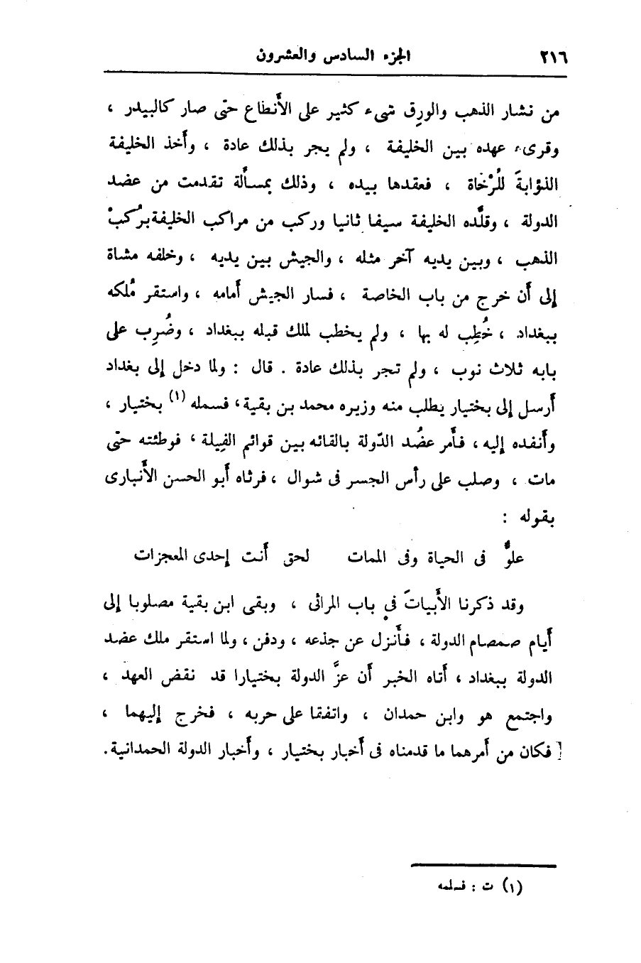 وقد ذكرنا الأبيات في باب المراثى، وبقى ابن بقية مصلوبا إلى أيام صمصام الدولة، فأنزل عن جذعه، ودفن، ولما استقر ملك عضد الدولة ببغداد، أتاه الخبر أن عزّ الدولة بختيارا قد نقض العهد، واجتمع هو وابن حمدان، واتفقا على حربه، فخرج إليهما، فكان من أمرهما ما قدمناه في أخبار بختيار، وأخبار الدولة الحمدانية.