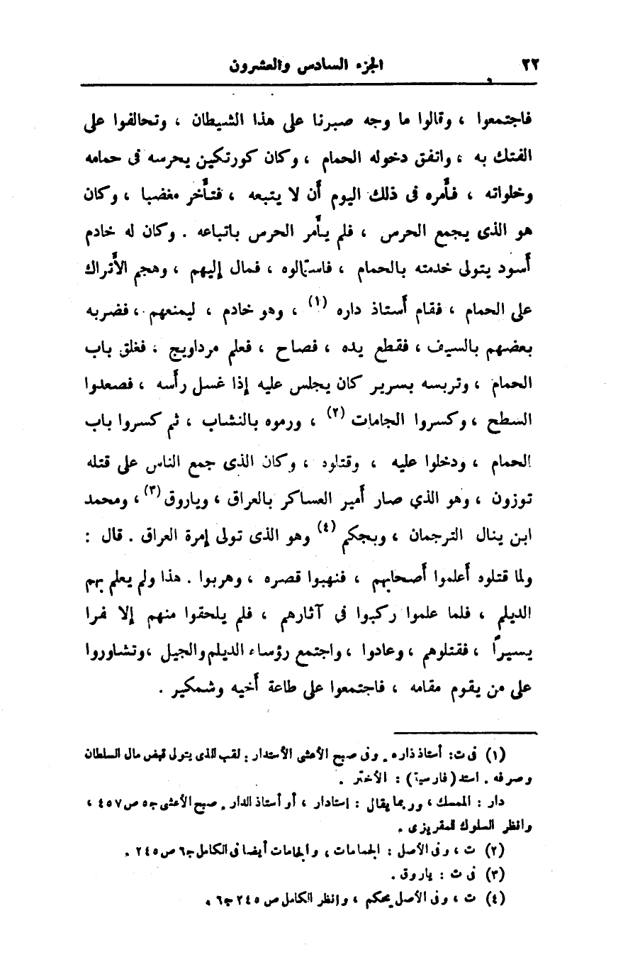 فاجتمعوا، وقالوا ما وجه صبرنا على هذا الشيطان، وتحالفوا على الفتك به، واتفق دخوله الحمام، وكان كورتكين يحرسه في حمامه وخلواته، فأمره في ذلك اليوم أن لا يتبعه، فتأخر مغضبا، وكان هو الذى يجمع الحرس، فلم يأمر الحرس باتباعه. وكان له خادم أسود يتولى خدمته بالحمام، فاستمالوه، فمال إليهم، وهجم الأتراك على الحمام، فقام أستاذ داره «1» ، وهو خادم، ليمنعهم، فضربه بعضهم بالسيف، فقطع يده، فصاح، فعلم مرداويج، فغلق باب الحمام، وتربسه بسرير كان يجلس عليه إذا غسل رأسه، فصعدوا السطح، وكسروا الجامات «2» ، ورموه بالنشاب، ثم كسروا باب الحمام، ودخلوا عليه، وقتلوه، وكان الذى جمع الناس على قتله توزون، وهو الذى صار أمير العساكر بالعراق، وياروق «3» ، ومحمد ابن ينال الترجمان، وبجكم «4» وهو الذى تولى إمرة العراق. قال: