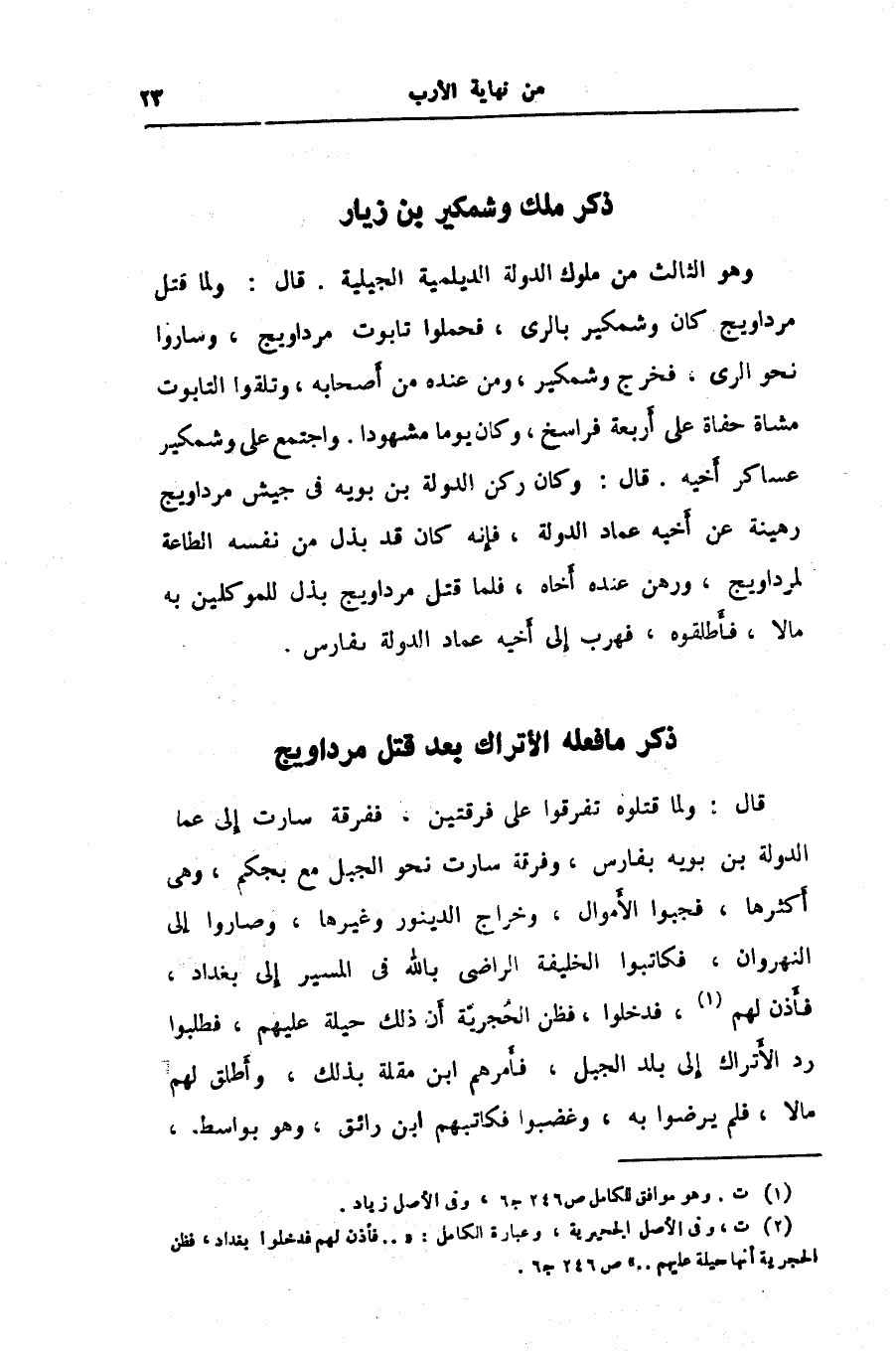 قال: ولما قتل مرداويج كان وشمكير بالرى، فحملوا تابوت مرداويج، وساروا نحو الرى، فخرج وشمكير، ومن عنده من أصحابه، وتلقوا التابوت مشاة حفاة على أربعة فراسخ، وكان يوما مشهودا. واجتمع على وشمكير عساكر أخيه. قال: وكان ركن الدولة بن بويه في جيش مرداويج رهينة عن أخيه عماد الدولة، فإنه كان قد بذل من نفسه الطاعة لمرداويج، ورهن عنده أخاه، فلما قتل مرداويج بذل للموكلين به مالا، فأطلقوه، فهرب إلى أخيه عماد الدولة بفارس. «1»