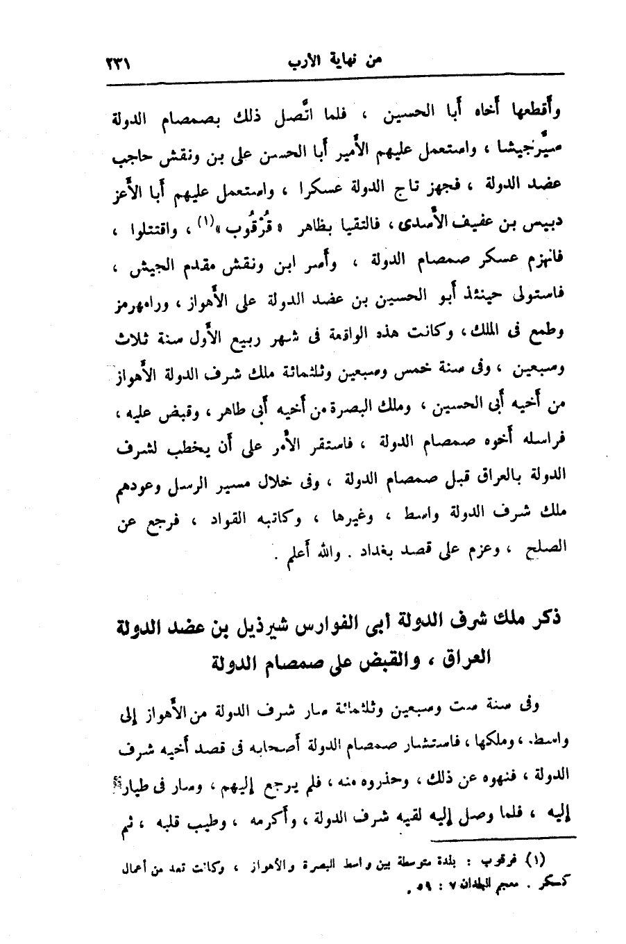 وأقطعها أخاه أبا الحسين، فلما اتّصل ذلك بصمصام الدولة سيّر جيشا، واستعمل عليهم الأمير أبا الحسن على بن ونقش حاجب عضد الدولة، فجهز تاج الدولة عسكرا، واستعمل عليهم أبا الأعز دبيس بن عفيف الأسدى، فالتقيا بظاهر «قرقوب» «1» ، واقتتلوا، فانهزم عسكر صمصام الدولة، وأسر ابن ونقش مقدم الجيش، فاستولى حينئذ أبو الحسين بن عضد الدولة على الأهواز، ورامهرمز وطمع في الملك، وكانت هذه الواقعة في شهر ربيع الأول سنة ثلاث وسبعين، وفي سنة خمس وسبعين وثلاثمائة ملك شرف الدولة الأهواز من أخيه أبى الحسين، وملك البصرة من أخيه أبى طاهر، وقبض عليه، فراسله أخوه صمصام الدولة، فاستقر الأمر على أن يخطب لشرف الدولة بالعراق قبل صمصام الدولة، وفي خلال مسير الرسل وعودهم ملك شرف الدولة واسط، وغيرها، وكاتبه القواد، فرجع عن الصلح، وعزم على قصد بغداد. والله أعلم.