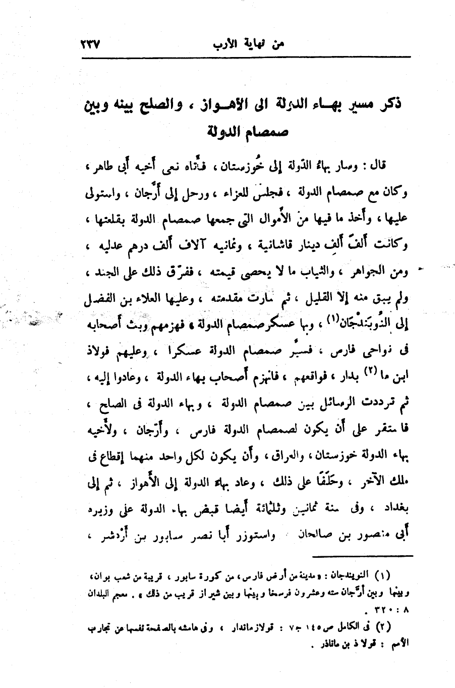 قال: وسار بهاء الدّولة إلى خوزستان، فأتاه نعى أخيه أبى طاهر، وكان مع صمصام الدولة، فجلس للعزاء، ورحل إلى أرّجان، واستولى عليها، وأخذ ما فيها من الأموال التى جمعها صمصام الدولة بقلعتها، وكانت ألف ألف دينار قاشانية، وثمانية آلاف ألف درهم عدليه، ومن الجواهر، والثياب ما لا يحصى قيمته، ففرّق ذلك على الجند، ولم يبق منه إلا القليل، ثم سارت مقدمته، وعليها العلاء بن الفضل إلى النوبندجان «1» ، وبها عسكر صمصام الدولة، فهزمهم وبث أصحابه فى نواحى فارس، فسيّر صمصام الدولة عسكرا، وعليهم فولاذ ابن ما «2» بدار، فواقعهم، فانهزم أصحاب بهاء الدولة، وعادوا إليه، ثم ترددت الرسائل بين صمصام الدولة، وبهاء الدولة في الصلح، فاستقر على أن يكون لصمصام الدولة فارس، وأرّجان، ولأخيه بهاء الدولة خوزستان، والعراق، وأن يكون لكل واحد منهما إقطاع في ملك الآخر، وحلفا على ذلك، وعاد بهاء الدولة إلى الأهواز، ثم إلى بغداد، وفي سنة ثمانين وثلاثمائة أيضا قبض بهاء الدولة على وزيره أبى منصور بن صالحان، واستوزر أبا نصر سابور بن أردشر،