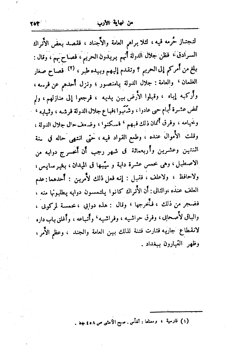 لتجتاز حرمه فيه، لئلا يراهم العامة والأجناد، فقصد بعض الأتراك السرادق، فظن جلال الدولة أنهم يريدون الحريم، فصاح بهم، وقال: