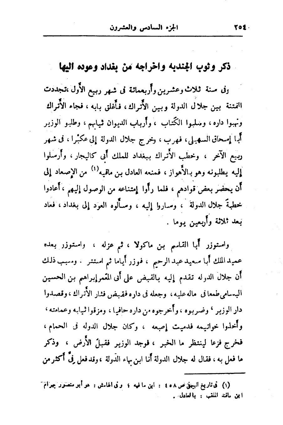 وفي سنة ثلاث وعشرين وأربعمائة في شهر ربيع الأول، تجددت الفتنة بين جلال الدولة وبين الأتراك، فأغلق بابه، فجاء الأتراك ونهبوا داره، وسلبوا الكتّاب، وأرباب الديوان ثيابهم، وطلبو الوزير أبا إسحاق السهيلى، فهرب، وخرج جلال الدولة إلى عكبرا، فى شهر ربيع الآخر، وخطب الأتراك ببغداد للملك أبى كاليجار، وأرسلوا إليه يطلبونه وهو بالأهواز، فمنعه العادل بن ماقيه «1» من الإصعاد إلى أن يحضر بعض قوادهم، فلما رأوا إمتناعه من الوصول إليهم، أعادوا خطبة جلال الدولة، وساروا إليه، وسألوه العود إلى بغداد، فعاد بعد ثلاثة وأربعين يوما.