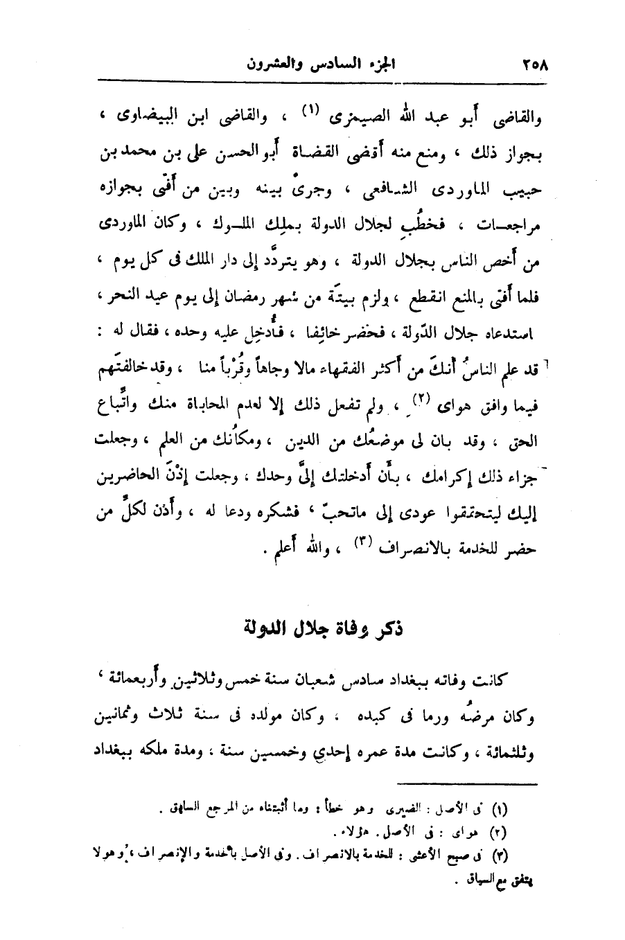 والقاضى أبو عبد الله الصيمرى «1» ، والقاضى ابن البيضاوى، بجواز ذلك، ومنع منه أقضى القضاة أبو الحسن على بن محمد بن حبيب الماوردى الشافعى، وجرى بينه وبين من أفتى بجوازه مراجعات، فخطب لجلال الدولة بملك الملوك، وكان الماوردى من أخص الناس بجلال الدولة، وهو يتردّد إلى دار الملك في كل يوم، فلما أفتى بالمنع انقطع، ولزم بيتة من شهر رمضان إلى يوم عيد النحر، استدعاه جلال الدّولة، فحضر خائفا، فأدخل عليه وحده، فقال له: