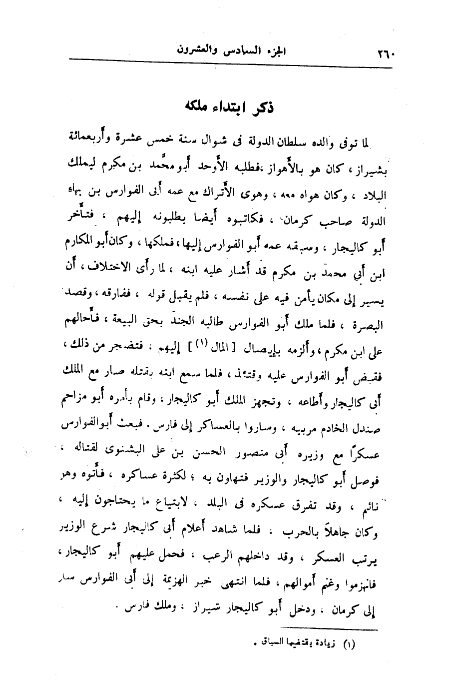 لما توفى والده سلطان الدولة في شوال سنة خمس عشرة وأربعمائة بشيراز، كان هو بالأهواز، فطلبه الأوحد أبو محمّد بن مكرم ليملك البلاد، وكان هواه معه، وهوى الأتراك مع عمه أبى الفوارس بن بهاء الدولة صاحب كرمان، فكاتبوه أيضا يطلبونه إليهم، فتأخر أبو كاليجار، وسبقه عمه أبو الفوارس إليها، فملكها، وكان أبو المكارم ابن أبى محمد بن مكرم قد أشار عليه ابنه، لما رأى الاختلاف، أن يسير إلى مكان يأمن فيه على نفسه، فلم يقبل قوله، ففارقه، وقصد البصرة، فلما ملك أبو الفوارس طالبه الجند بحق البيعة، فأحالهم على ابن مكرم، وألزمه بإيصال [المال «1» ] إليهم، فتضجر من ذلك، فقبض أبو الفوارس عليه وقتئذ، فلما سمع ابنه بقتله صار مع الملك أبى كاليجار وأطاعه، وتجهز الملك أبو كاليجار، وقام بأمره أبو مزاحم صندل الخادم مربيه، وساروا بالعساكر إلى فارس، فبعث أبو الفوارس عسكرا مع وزيره أبى منصور الحسن بن على البشنوى لقتاله، فوصل أبو كاليجار والوزير فتهاون به؛ لكثرة عساكره، فأتوه وهو نائم، وقد تفرق عسكره في البلد، لابتياع ما يحتاجون إليه، وكان جاهلا بالحرب، فلما شاهد أعلام أبى كاليجار شرع الوزير يرتب العسكر، وقد داخلهم الرعب، فحمل عليهم أبو كاليجار، فانهزموا وغنم أموالهم، فلما انتهى خبر الهزيمة إلى أبى الفوارس سار إلى كرمان، ودخل أبو كاليجار شيراز، وملك فارس.